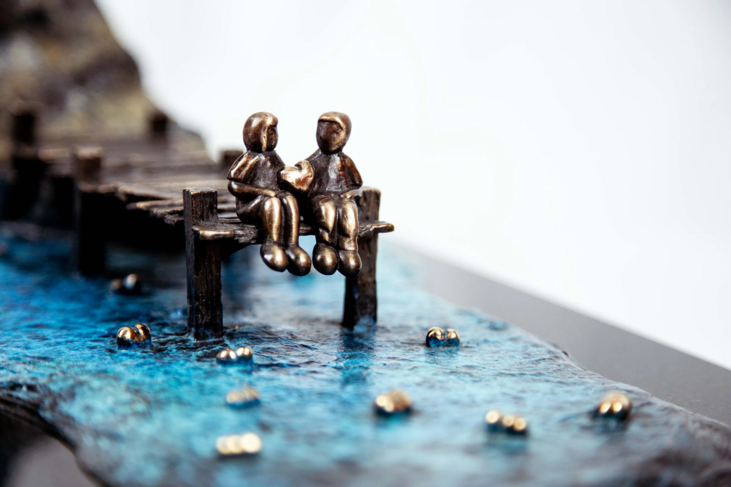 A Light in the Storm by Mackenzie Thorpe is a striking and deeply emotional sculpture that beautifully embodies themes of resilience, love, and unity. Renowned for his evocative and heartfelt artwork, Thorpe once again captures the profound human experience of connection amidst life’s challenges.This compelling piece depicts a couple seated at the edge of a jetty, their figures simple yet profoundly expressive in Thorpe’s signature style. Between them, they hold a glowing heart—a symbol of love’s enduring power to guide and sustain. Beneath them, a sea, lake, or river of hearts flows, representing the vast emotions and shared experiences that have shaped their journey together.