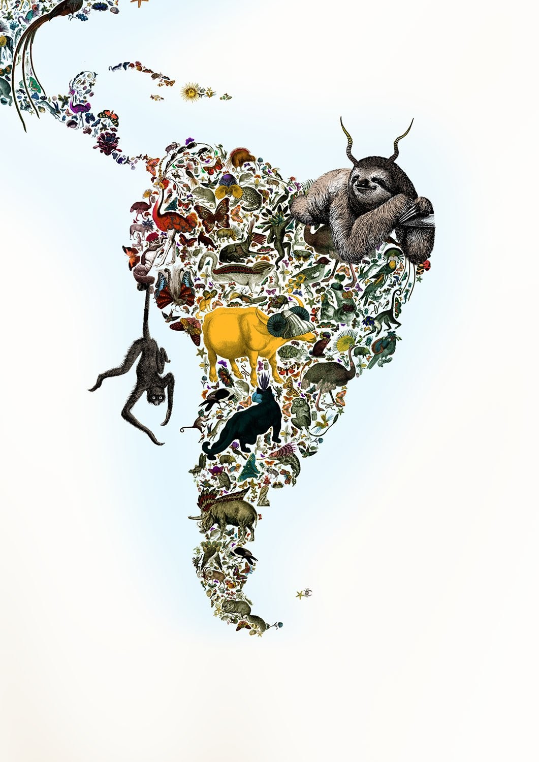 A contemporary and uplifting, fine art Limited Edition print paying homage to humble postage stamps and their improbable trajectory up and over maps of the world, making connections as they go. Here, stamps and maps are hand in hand, telling infinite stories about all of the people, places and lives that they encounter. The edges of the stamp give the illusion of floating above a light grey backdrop, mirroring the movement of the stamp as it travels, passing through so many hands, and eventually linking one person to another. This map of the Americas has been shrunk down and encapsulated on the surface of a tiny stamp that belies the abundance of life that it holds. Just a little piece of paper, yet so powerful, connecting people and places without boundaries. Across the whole piece, a subtle shift through the colours of the rainbow signifies acceptance of difference. In Iceland, Kristjana has experienced the powerful, unifying force of the Pride Festival, attended by almost the entire population. The connections we make with our fellow creatures, both nearby and around the world, are vital to promoting unity and acceptance.America's Dyragardur Express