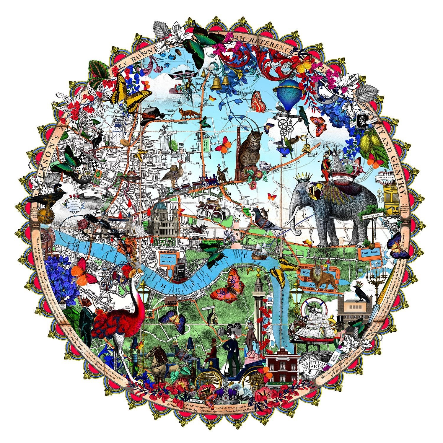 The East print of a pair of circular London maps created in 2019. In Kristjana's unique way the map comes alive with fun historical facts, the cities buildings and fantastical animals.