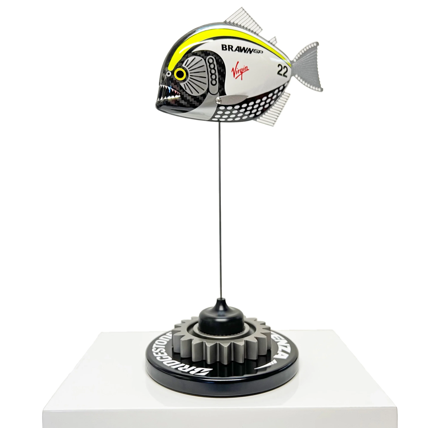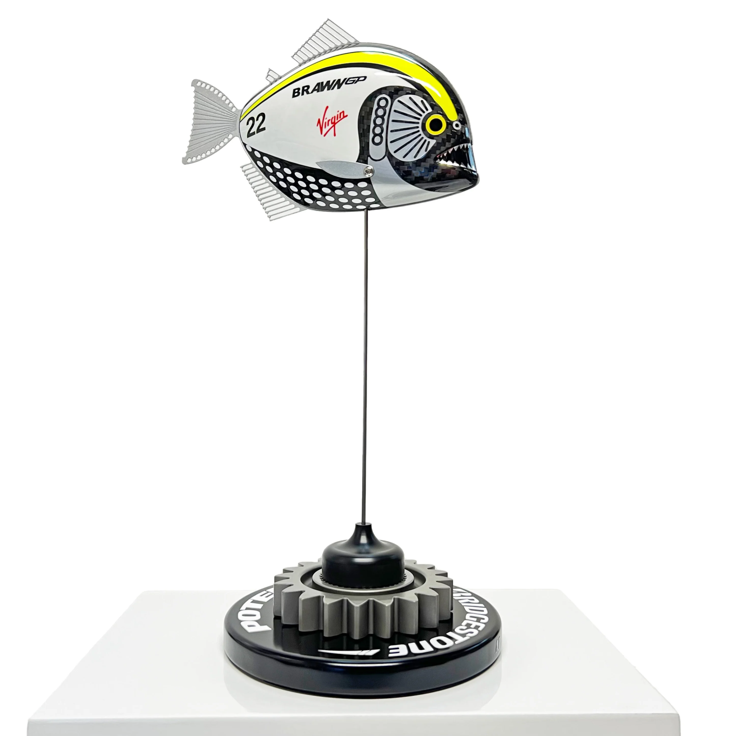 Mounting base and rod: Mounted on a black coated wooden base with Bridgestone tyre ID logo and a gear from a modern Formula One GP car and stainless steel rod.