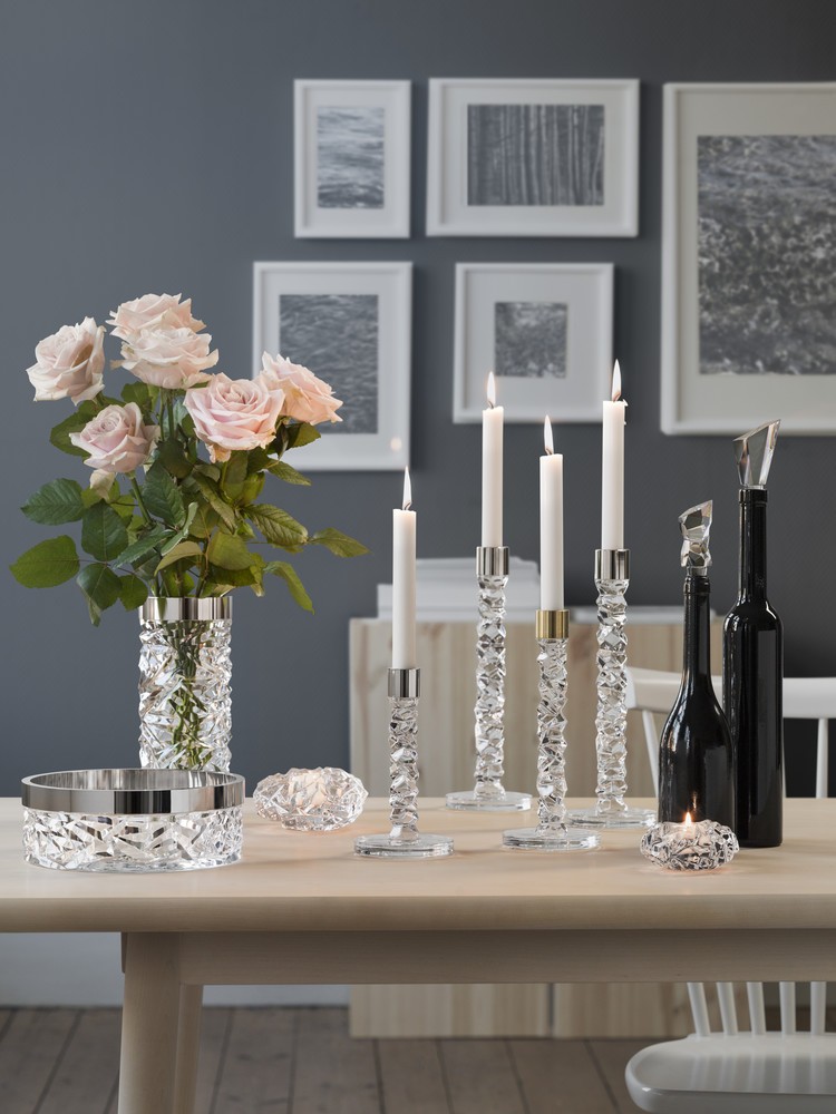 With inspiration from jewels and gemstones, Lena Bergström has renewed the cut crystal with the glass series Carat. The sharp and unique asymmetrical grinding re-enacts our times with a scent of Nordic romance. The candlestick, a stand on solid feet and glitter even without a candle. With legs like cut diamonds stacked on each other and nished by a stylish candle holder in brass or platinum colour. The various sizes of the candlestick form a harmonious trio that can grow into an entire forest of cut crystal. The low sparkly votives is a ne contrast to the high candlesticks.