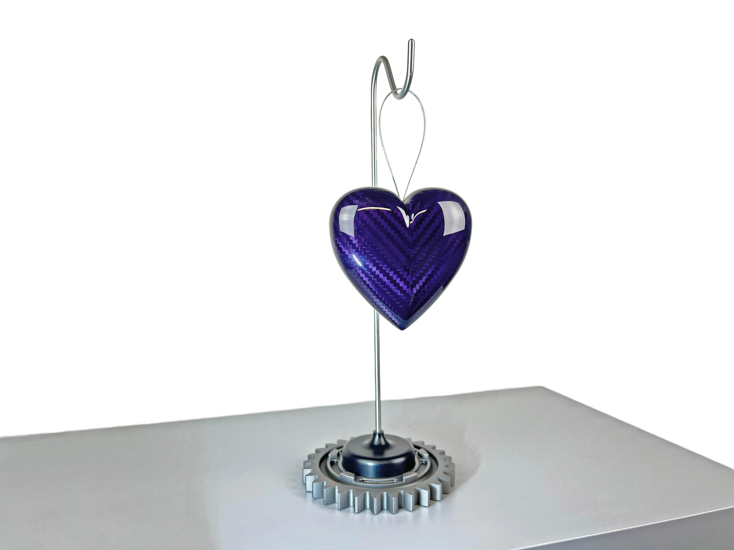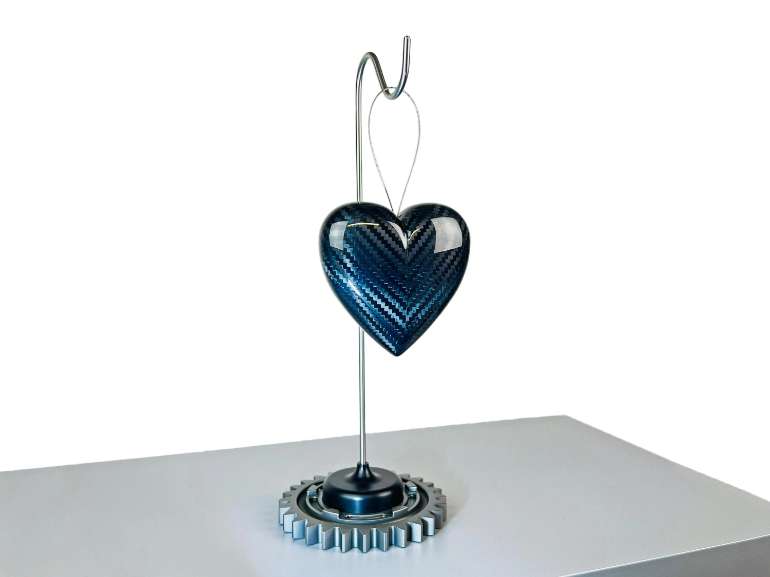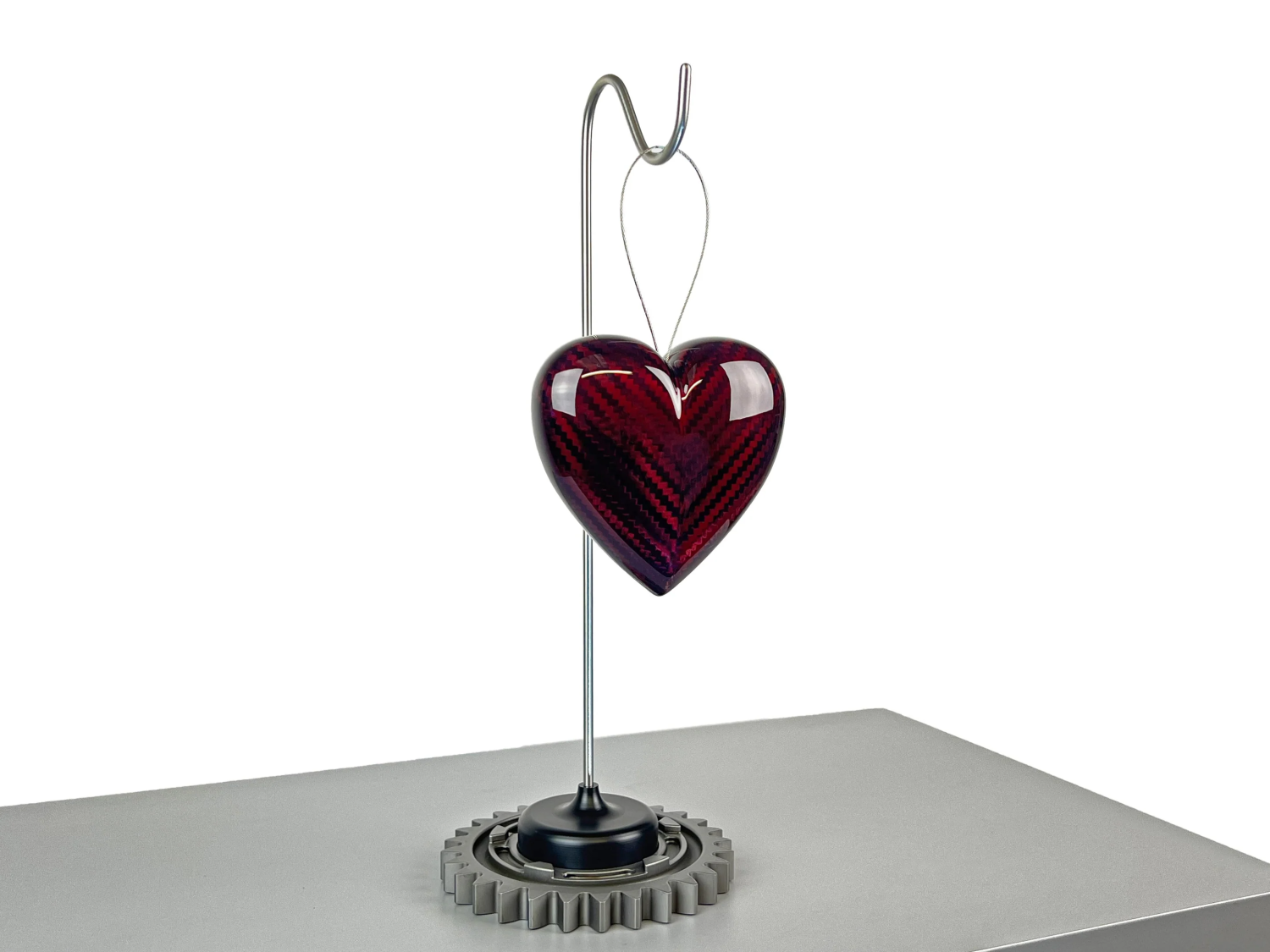 The sculpture can be displayed on its bespoke stand—featuring an authentic gear from a modern Formula One car—or as a free-hanging piece for flexible placement in any space. Whether mounted on a desk or suspended as a statement artwork, the Carbon Heart brings together precision engineering, racing heritage, and symbolic design.