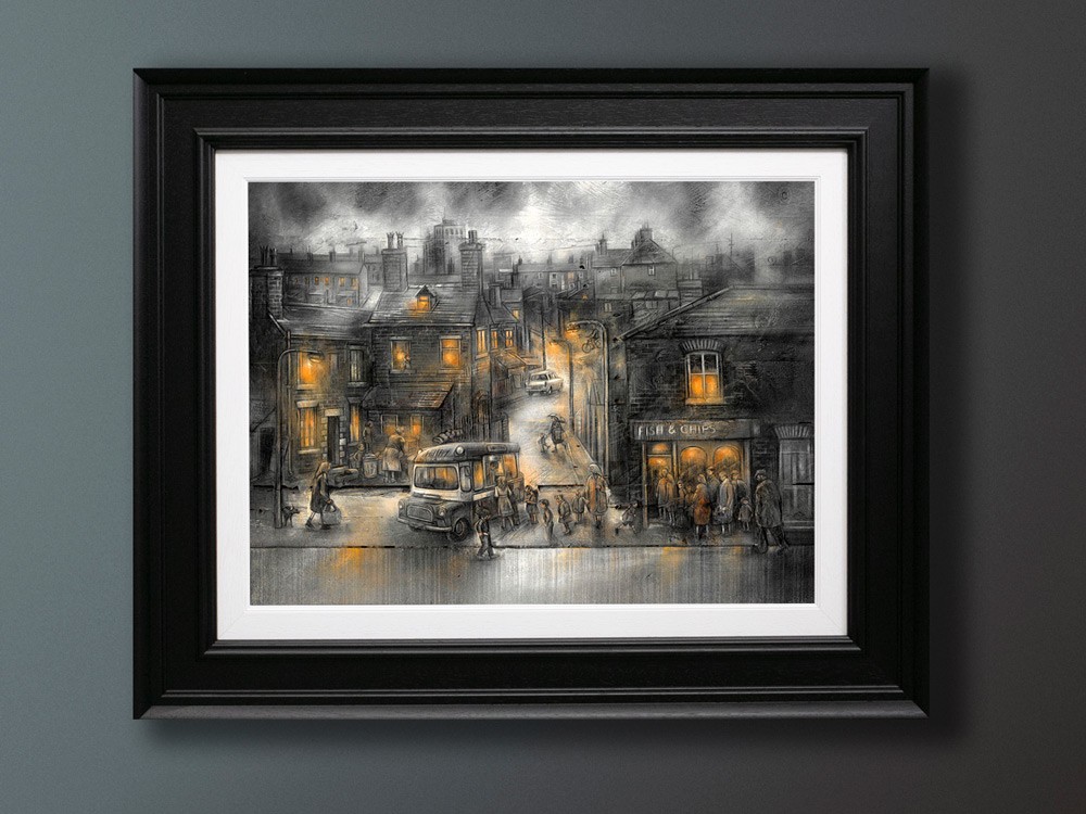 Rendered in a restrained, darker palette, the piece evokes memories of colder nights, newspaper-wrapped suppers, and the familiar ritual of bringing home fish and chips. Subtle tones, shadowed contrasts, and carefully observed detail create a sense of time and place, transforming an everyday moment into something reflective and almost cinematic.
