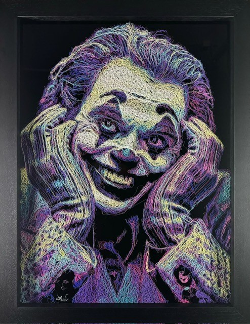 At the heart of “C’mon Smile” is Zalini’s meticulously developed scribble technique, refined over six years of experimentation. Using syringes to apply fine, three-dimensional lines of paint, he allows gravity to guide each movement, building intricate layers that give the Joker’s face a striking sense of depth and motion. The result is a hypnotic composition where every line contributes to the character’s volatile presence.
