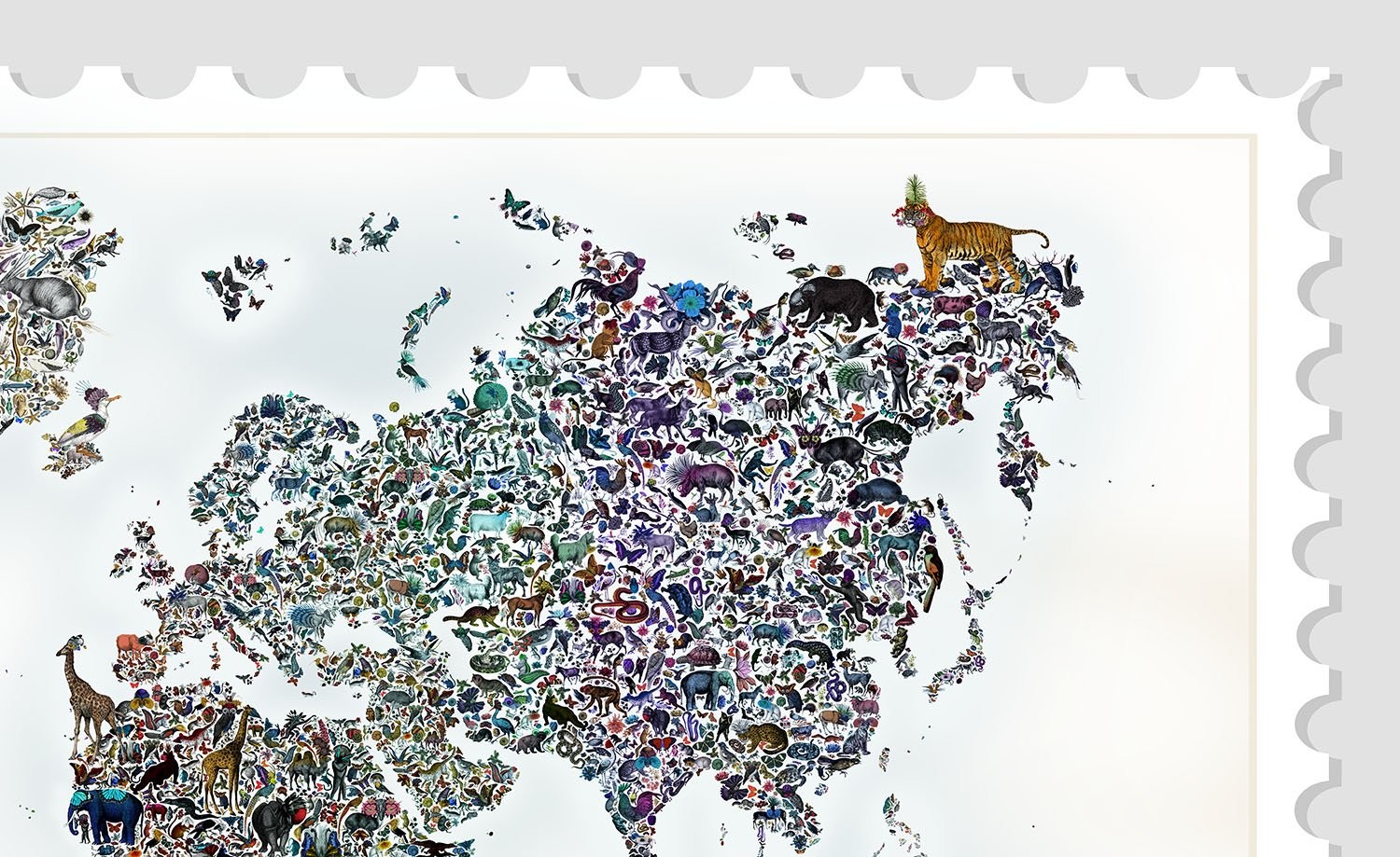 A contemporary and uplifting, fine art Limited Edition print paying homage to humble postage stamps and their improbable trajectory up and over maps of the world, making connections as they go. Here, stamps and maps are hand in hand, telling infinite stories about all of the people, places and lives that they encounter. The edges of the stamp give the illusion of floating above a light grey backdrop, mirroring the movement of the stamp as it travels. The map has been shrunk down and encapsulated on the surface of a tiny stamp that belies the abundance of life that it holds. Just a little piece of paper, yet so powerful, connecting people and places without boundaries. Graphically beautiful animals and insects pose in shapes that build the contours of their homelands; wallabies in Australia, cougars in the Andes and Macaque monkeys in South Asia. Across the whole piece, a subtle shift through the colours of the rainbow signifies acceptance of difference. In Iceland, Kristjana has experienced the powerful, unifying force of the Pride Festival, attended by almost the entire population. The connections we make with the rest of the world are vital to promoting unity and acceptance.Dyragardur of The World Express
