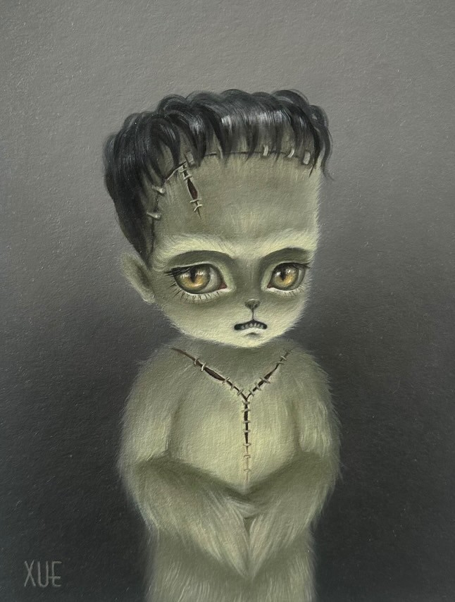 In this striking portrait, Wang reinterprets Mary Shelley’s Frankenstein through her unique blend of vintage surrealism and contemporary pop narrative. A meticulously styled, doll-like figure — part human, part creature — gazes outward with both innocence and defiance. Surrounding her, delicate details and nostalgic motifs evoke the tension between the monstrous and the endearing.