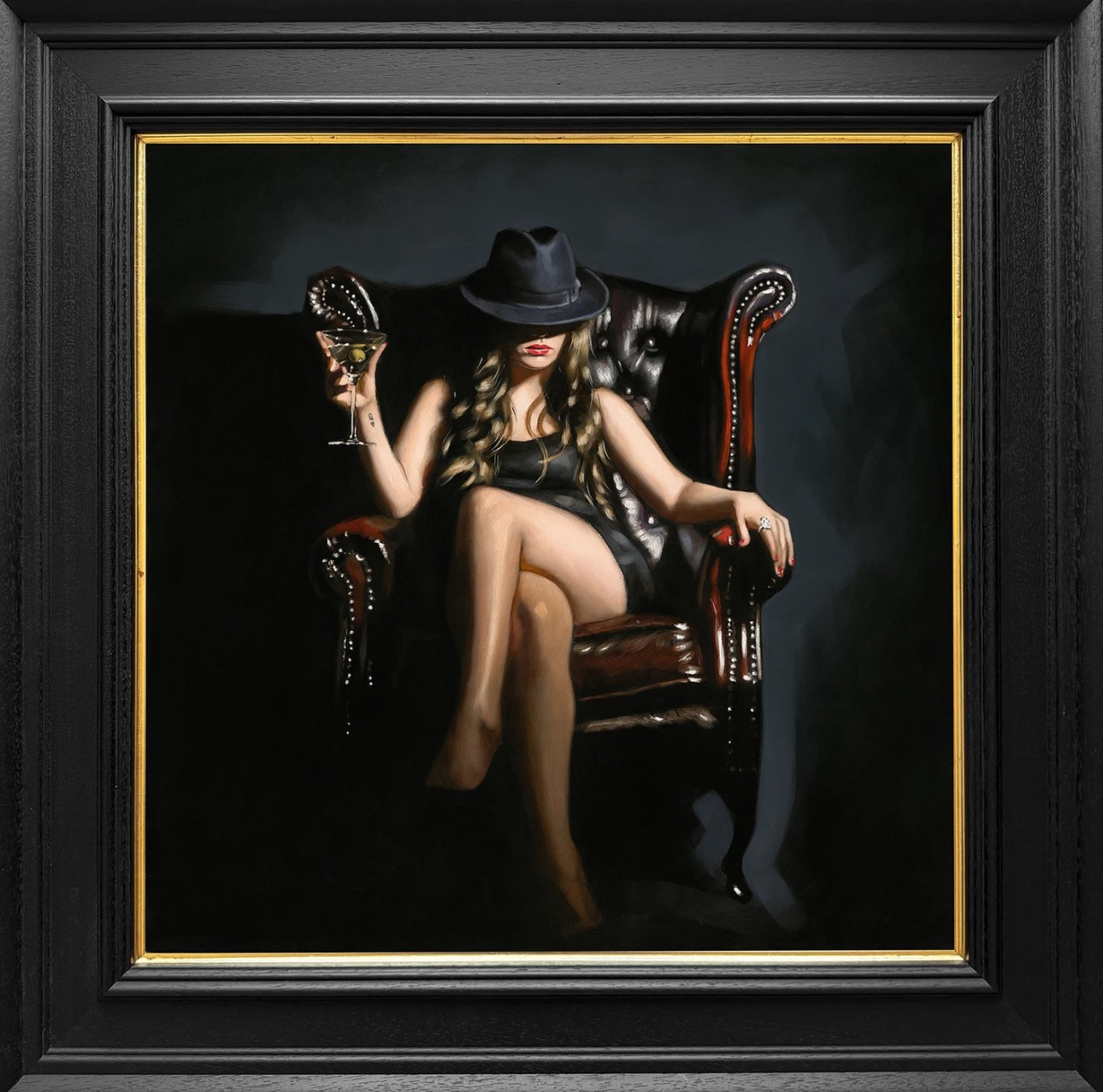 The scene features a lady seated with legs crossed in a high, wing-backed chair, exuding confidence and poise. In one hand, she holds a dirty martini, a subtle symbol of sophistication and independence. Blunt’s composition captures a moment of self-assurance and quiet triumph, portraying a woman who knows her worth and the power of her presence. The artwork balances elegance, attitude, and narrative tension, making the viewer feel part of this intimate, commanding tableau.