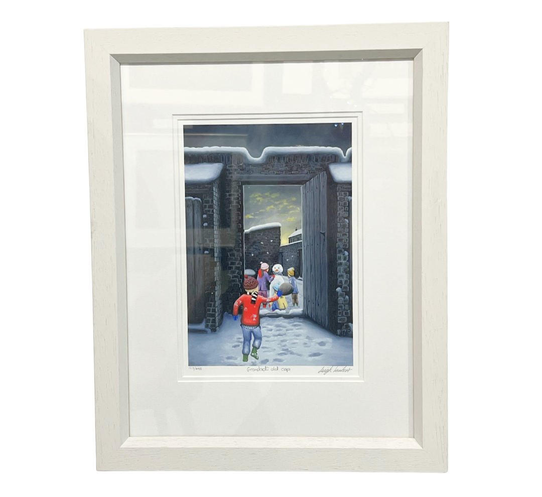 Grandad’s Old Cap by Leigh Lambert is a beautifully nostalgic winter scene that blends childhood imagination with heartfelt remembrance. Set on a snowy day, the artwork captures a tender moment as a child places Grandad’s old cap atop a freshly built snowman, transforming it into a gentle tribute filled with warmth and meaning.