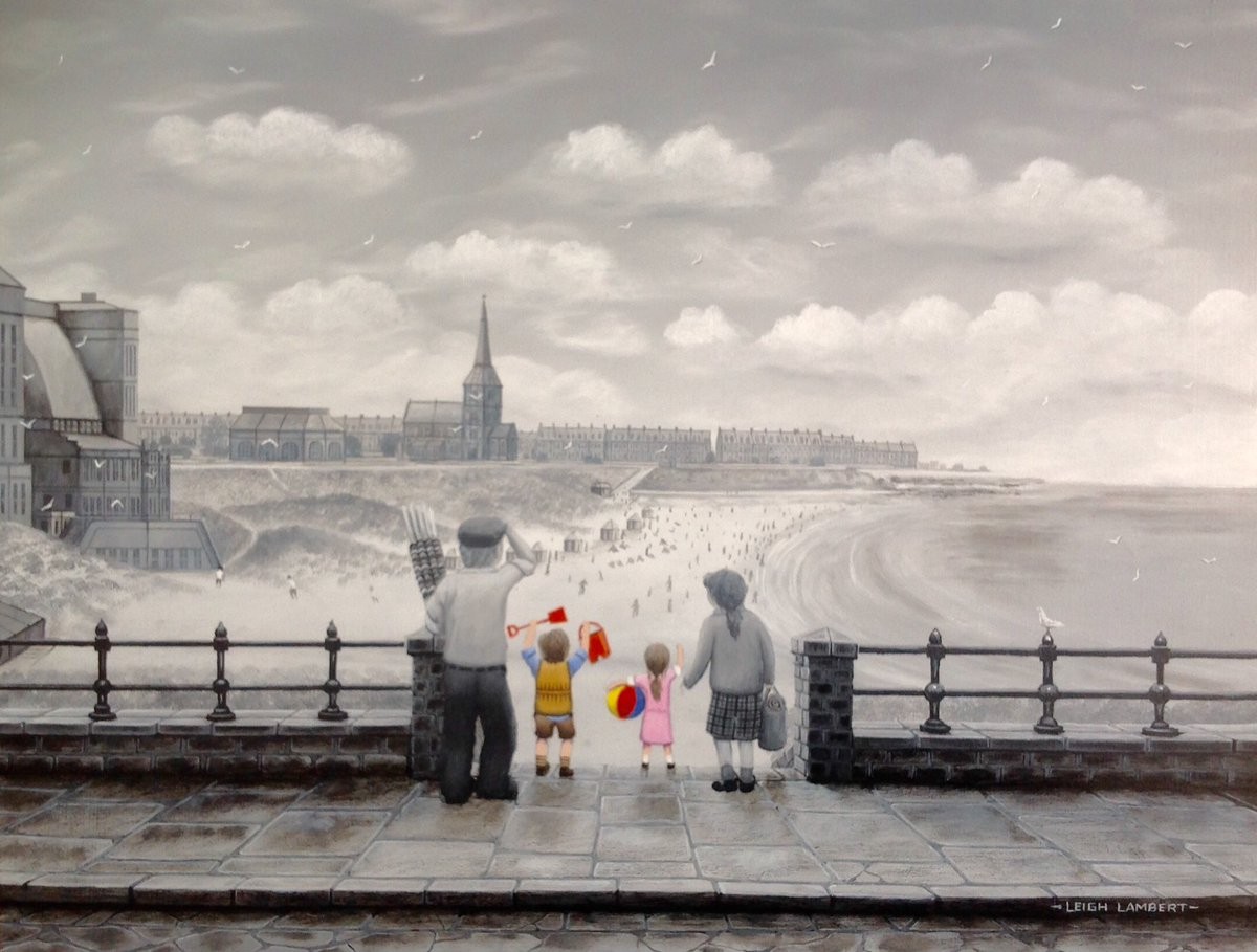 Step into a moment of quiet triumph and togetherness with Here at Last by Leigh Lambert. This evocative artwork captures a family standing at a seaside promenade, gazing out over a sweeping shoreline after what feels like a long-awaited journey. Rendered in Lambert’s signature muted palette, the scene is infused with atmosphere—soft skies, distant architecture, and a gently curving beach that draws the eye toward the horizon.Subtle splashes of color in the children’s toys contrast beautifully with the restrained tones of the landscape, symbolizing joy, arrival, and the simple pleasures of being together. The figures are viewed from behind, inviting the viewer to step into the scene and share in the sense of anticipation, nostalgia, and calm reflection.