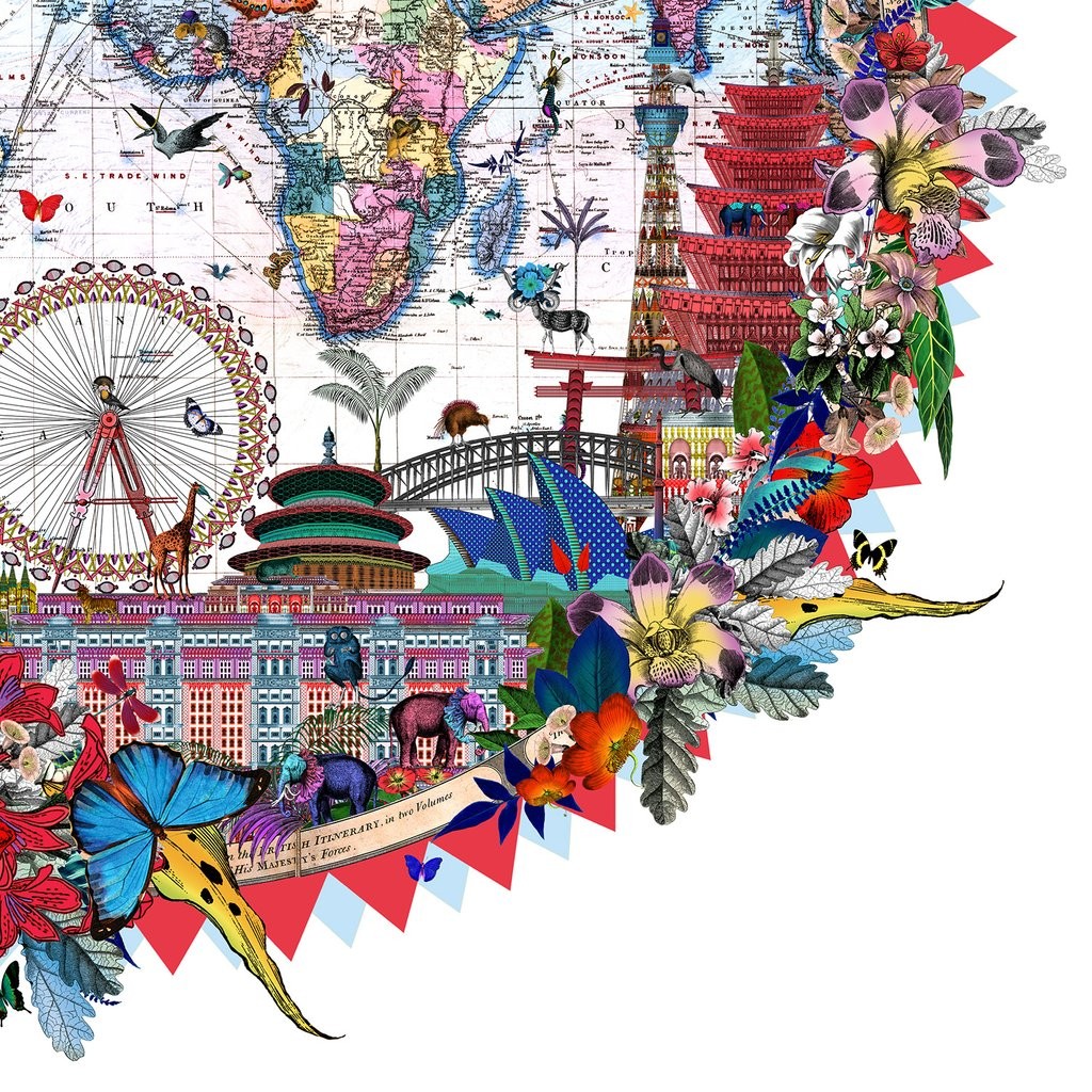 Circular World map wall art. This digital collage art print features iconic buildings from some of the worlds major cities and Kristjana brings it to life with colourful foliage and fantastical animals some of which fly above the world in magical hot air balloons.