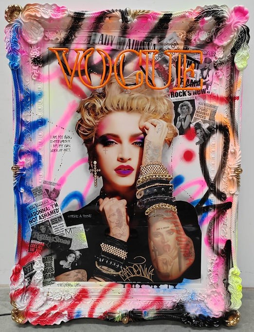 "I Am My Own Work of Art" by GHOST is a stunning piece of art that pays homage to the queen of pop, Madonna. The piece features Madonna herself set against a vibrant 80's palette, with a bold neon orange VOGUE making a powerful statement.