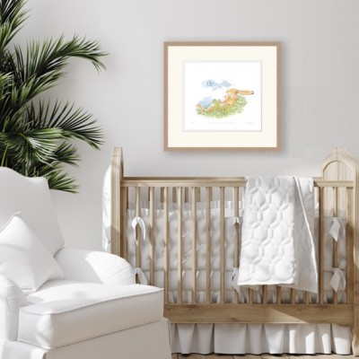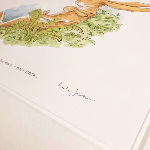 A beautiful illustration by Anita Jeram from Sam McBratney's heartwarming children's book 'Guess how much I love you'. The story of Little Nutbrown hare and Big Nutbrown hare, translated into 27 languages. Hand signed & numbered, with certificate of authenticity. Comes in beautiful wood effect frame.
