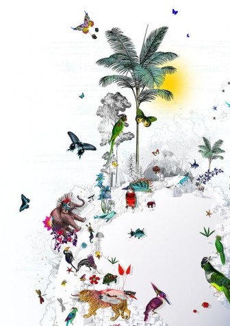 A globe is blanketed with a layer of purest snow, yet glows with the warmth of the tropics. Invisible oceans sustain a life force that belies its crisp white carpet and is alive with colour, life and vivacity. Continents stand like beacons, their mountains or cities depicted in the starkest white, while flamboyant animals roam freely on this empty stage, masters of their own will in a world where flora and fauna can play out in a carnival of pleasure. The charismatic Asian leopard prowls keenly over the Americas; ever watchful, always graceful, and dignified in its landscaped headdress. A luminous parakeet stands watch off the coast of Africa, a gulf of white between its opponent Kingfisher, sharp as a razor in regal magenta. An exquisite Indian peacock irreverently displays in Mongolia, while palms soar skyward from the poles. The sun sets, casting its shadow, and the heroes of terra firma blend with the subterranean world, as life giving corals, ancient ammonites and five-arm starfish traverse the tropical to frigid polar waters.Isol Hnottur
