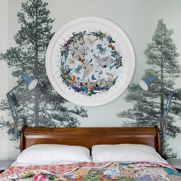 Framed by a garland-like floral border, nature takes center stage. Icelandic creatures traverse the continents, bringing the island’s magic and curiosities to life. Giant octopuses glide alongside fluttering butterflies and emerging moths; the Icelandic horse stands proud, ready for its next journey; prophetic symbols coexist in surprising harmony within this otherworldly realm. Human presence is subtly woven in, represented through buildings that reflect industry, history, and modernity. Here, humanity and nature meet in balance, celebrating Iceland in all its wonder.