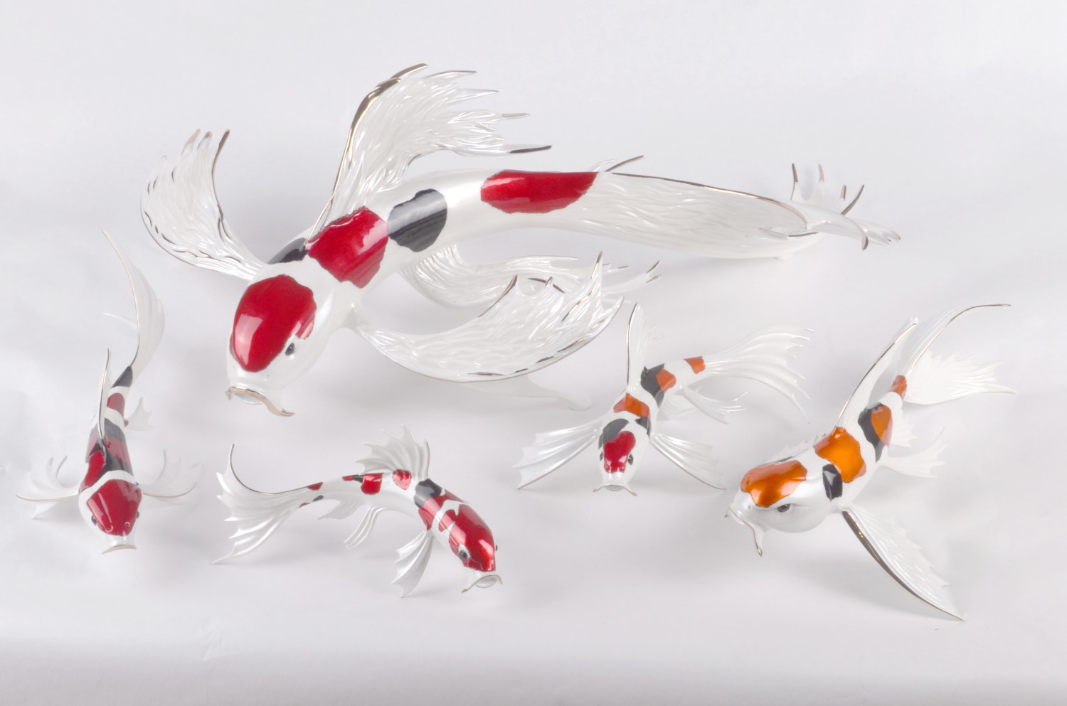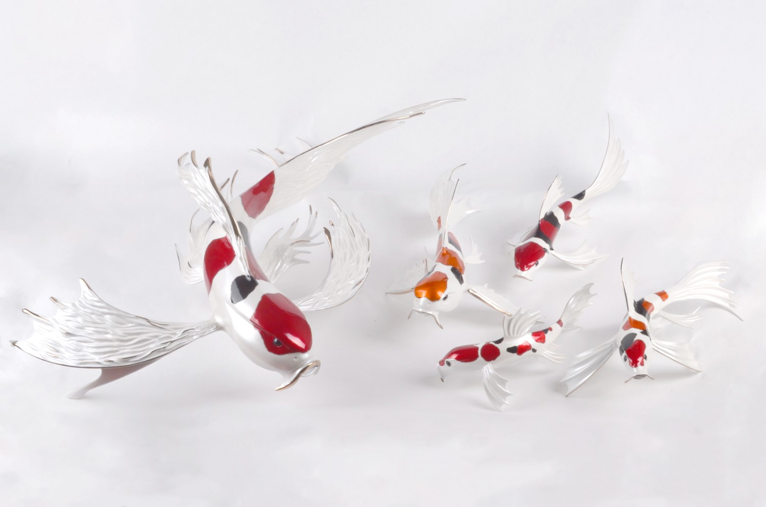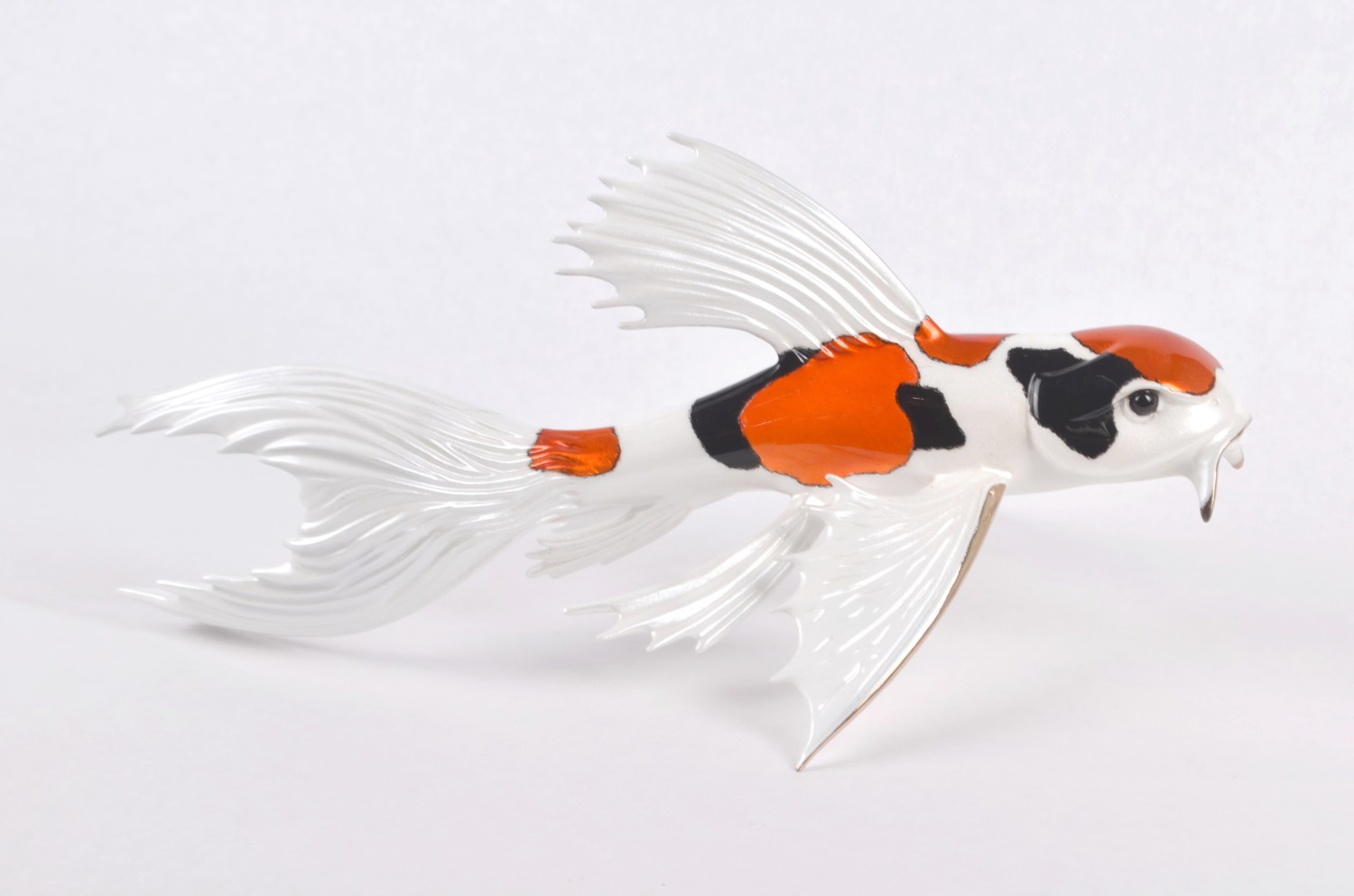 With its delicately sculpted body and flowing, feather-like fins, this piece feels as if it’s gliding effortlessly through water. Vibrant red accents ripple across its glossy white form, complemented by subtle dark markings that add depth and character. Every detail is carefully crafted to capture the quiet poetry of movement.