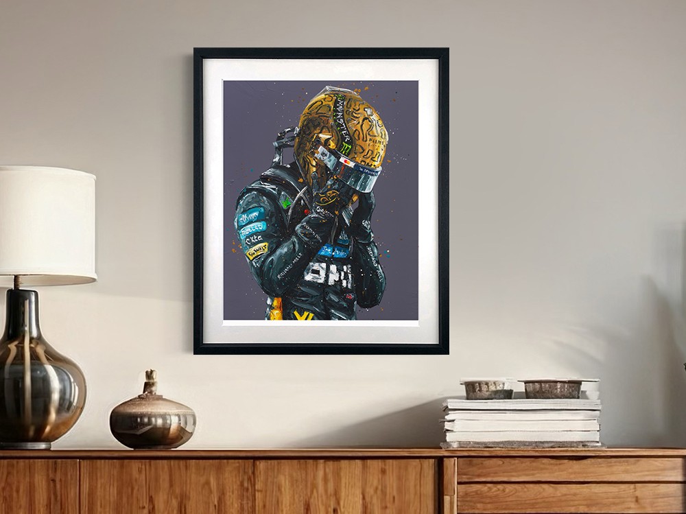 This exceptional new artwork celebrates the first World Championship title victory of British driver Lando Norris, captured in the powerful and emotive portrait titled “Lando – Golden Tears.”