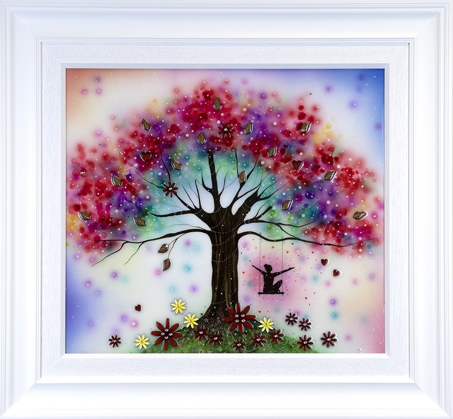 A young girl sat swinging freely on beautiful tree standing tall surrounding by blooming flowers and love.