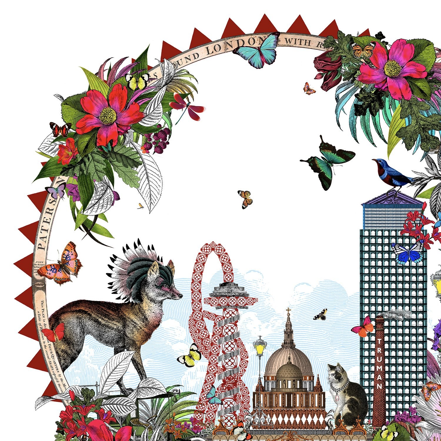 Circular wall art print of the great city of London, designed in early 2018. The art print has iconic buildings from this great city and Kristjana brings it to life with colourful foliage and fantastical animals.