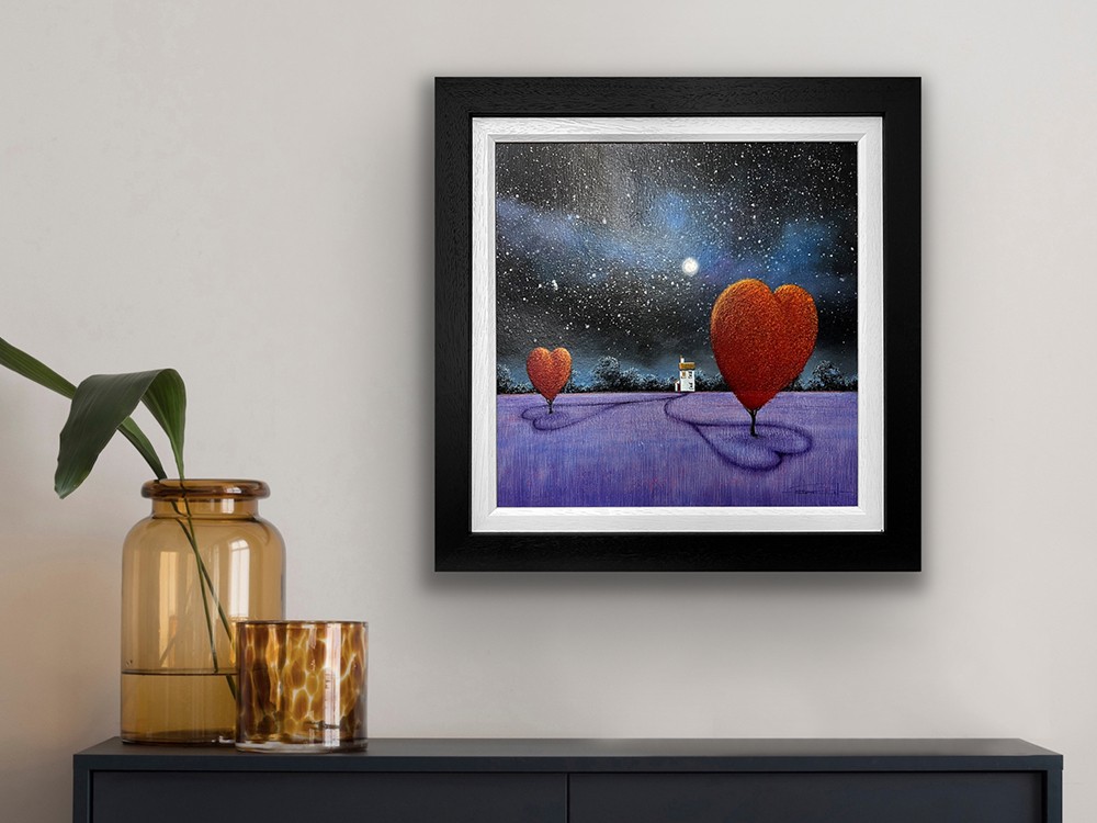 Bring a touch of romance and elegance into your space with this original acrylic artwork by Dale Bowen, enhanced with metallic leaf embellishments. Painted on artist-grade marine ply and finished with a matte UV-protective lacquer, this piece radiates warmth and vibrancy. It is framed in a double-depth white wood profile with inner slip moulding for a contemporary, gallery-ready finish.