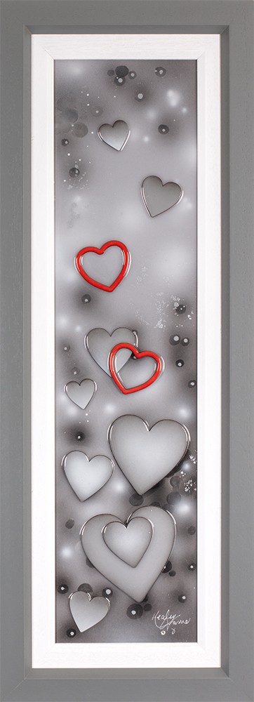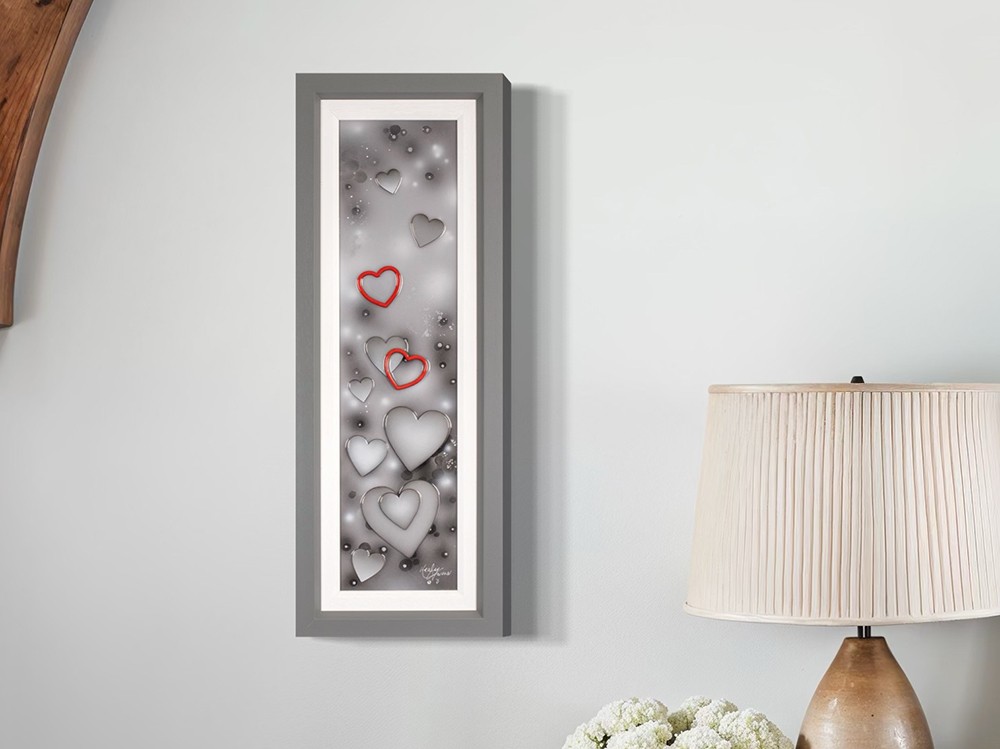 Love Is In The Air is a stunning original boutique artwork by Kealey Farmer, set against a sleek resin grey background. The piece features a burst of love hearts, with two red hearts prominently placed, symbolizing love and connection. The soft, contemporary tones are beautifully balanced with the bold, passionate reds, creating a striking and emotional effect. Perfect for modern interiors, Love Is In The Air is a vibrant and meaningful piece, ideal for art collectors, those seeking statement wall art, or anyone wishing to bring warmth and love into their space.