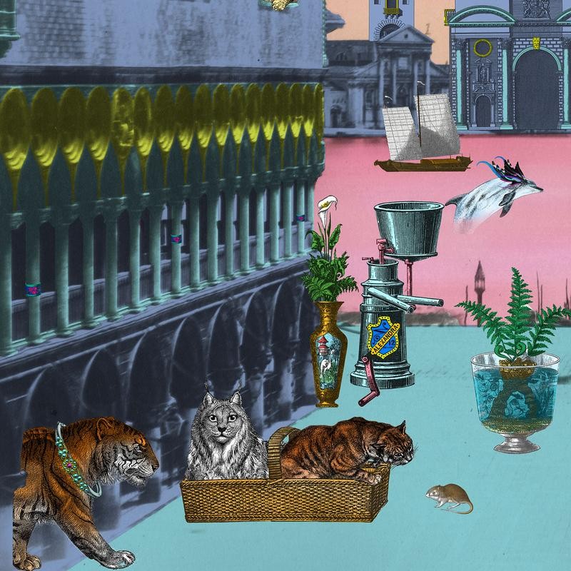 Magnificent St Mark’s has been flooded with a proliferation of animalia, evolved species settling in to their new environment, humanesque, yet human free. Objects of beauty have been sequestered from the Doges Palace; an exquisite condiment set a vehicle for a tiny dog, a gold leafed bathtub commandeered by a majestic tiger, and a classical terrarium, nurturing an explosion of flora upon an otherwise grey stone plaza. Giant cats appear from upper windows to survey the scene below. But there is no hierarchy here; old adversaries work as one as a basketed feline invites in a diminutive mouse. Spot feathered Adriatic dolphins, dancing in the lagoon; their fabled presence with this floating Italian city, a symbol of the incredible power of nature over the forces of humankind.