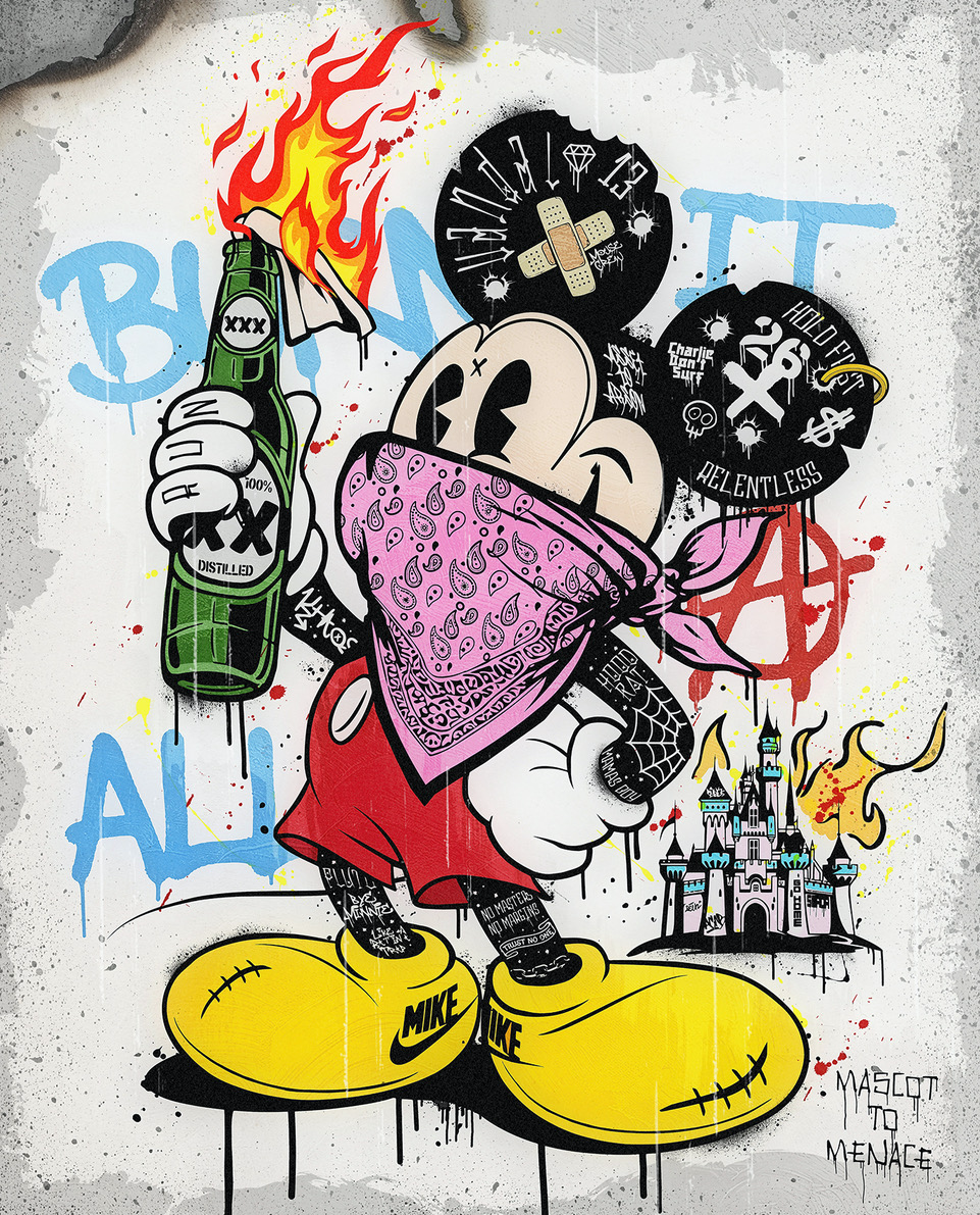 JJ's Mickey Mouse cartoon portrait has been wonderfully created with anarchy in mind, but with a smile (which is always important). The second of a matching pair of low numbered editions, these works are bright & colourful and grab the eye with a fun take of the most iconic of retro characters.