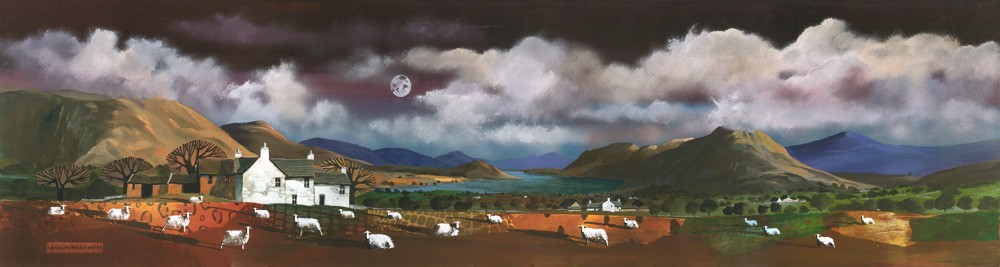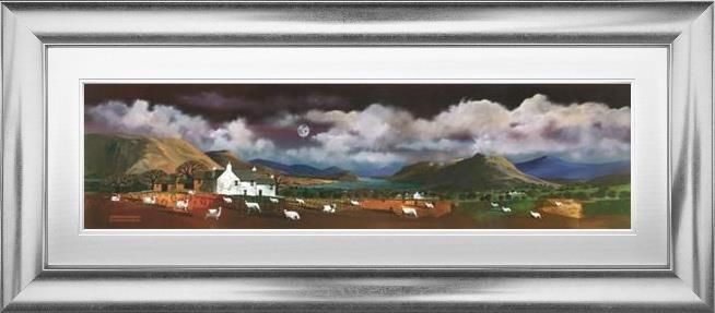 Moonlit Water, limited edition print by artist Nick Potter. Hand signed & numbered with certificate of authenticity and in frame.Living in the country and fuelled by frequent visits to Cornwall, Scotland and the Lake District Nick was inspired to do Landscape painting. This led to years of experimentation with different media which is when he discovered the vibrancy of acrylic inks, using them like watercolour paints.