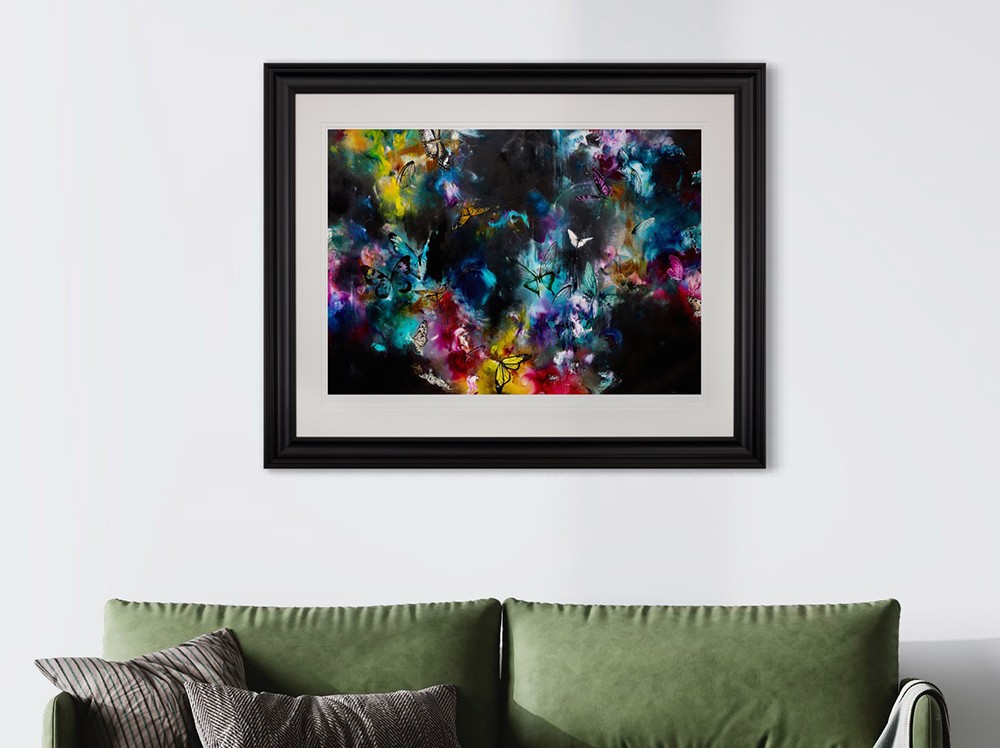 NEBULA is an infinite swirl of fluttering butterflies, weaving in and out of nebula like auras and flares. Both calming and chaotic, the rich colours invite you closer, and the detail will keep you there. Celebrating the delicate and intricate wings of lepidoptera and the varieties of colours, patterns and detail that their wings offer. The challenge of the artist for this piece was to create a kinetic energy within a 2d image.