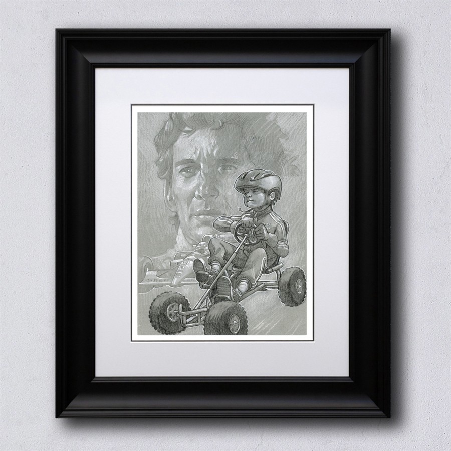 Step back into the thrill of childhood with Craig Davison’s Need for Speed. This evocative piece captures a young boy racing his Go-Kart, eyes full of determination, imagining himself as the legendary Ayrton Senna. Every detail—from the wind in his hair to the intensity of his focus—transports viewers to those carefree days of speed, competition, and boundless imagination.