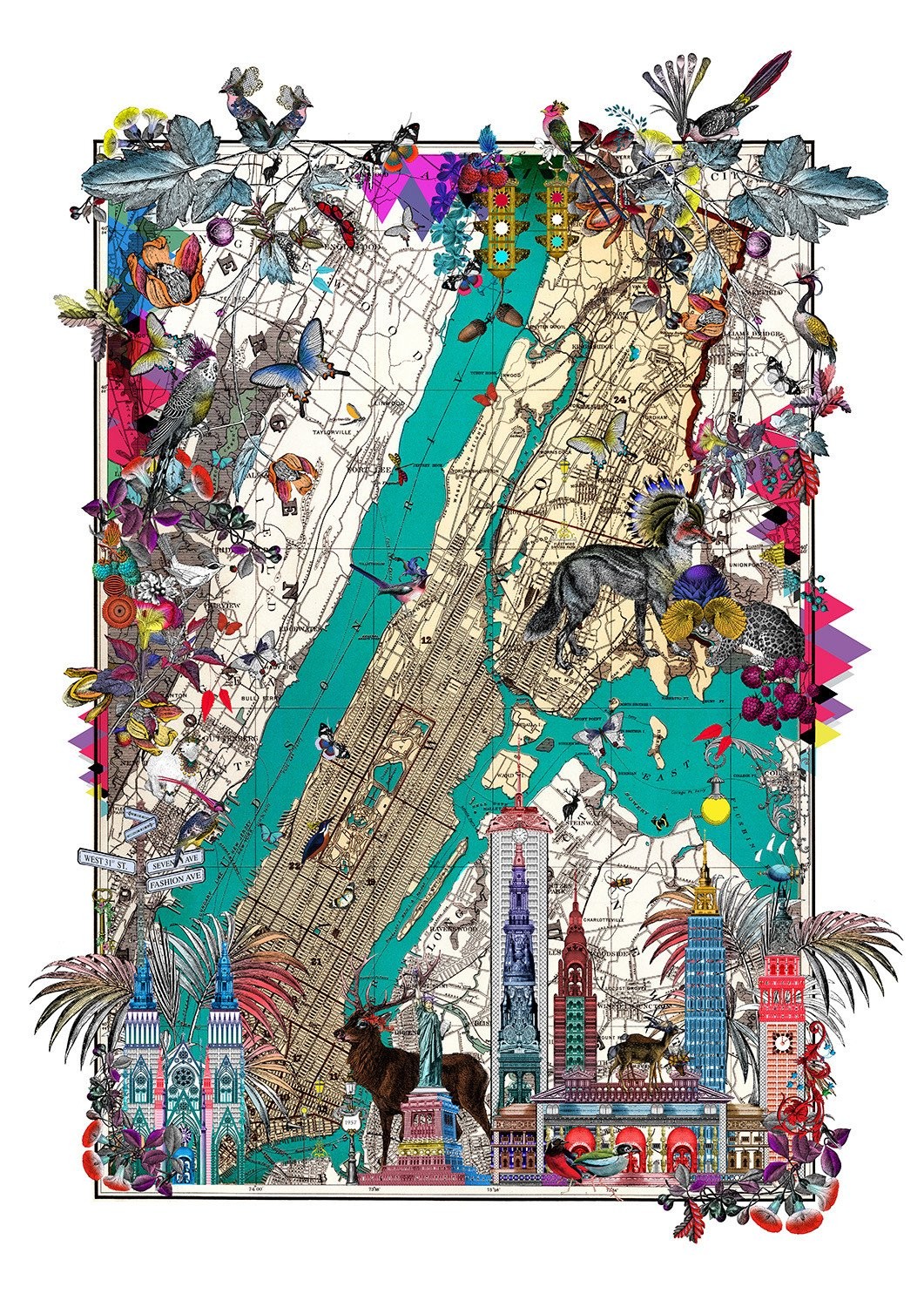 Map of Manhattan island in the Great City of New York, created for the Affordable Art Fair in New York in 2017, exhibited by Tag Fine Arts. Inspired by the city's iconic architecture and history.Nyja Jorvik - Undra Skagi 2017