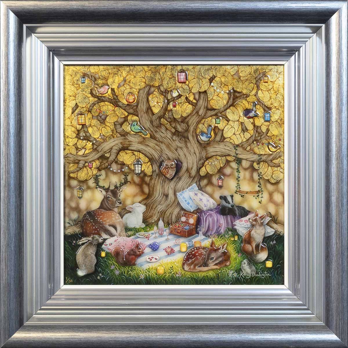 Our Golden Canopy by Kerry Darlington presents a serene gathering beneath a luminous gold-leaf tree, where wildlife rests in quiet harmony. Deer, rabbits, foxes, and birds come together naturally, as soft lantern light glows through the branches and a simple picnic sits untouched below.