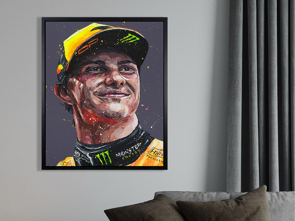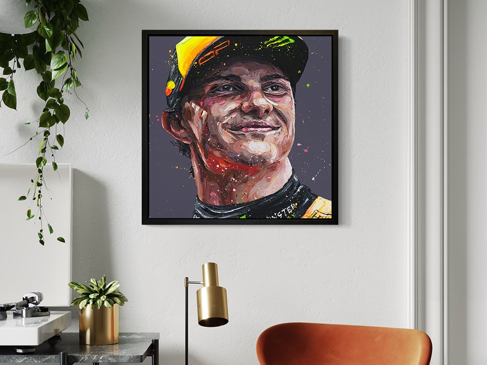 The bold contrasts, vivid racing colours, and dynamic brushwork make the portrait feel alive, as if the engine is still running beneath the paint. Whether displayed in a living room, office, garage, or collector’s space, it instantly becomes a conversation piece for fans of modern Formula 1.