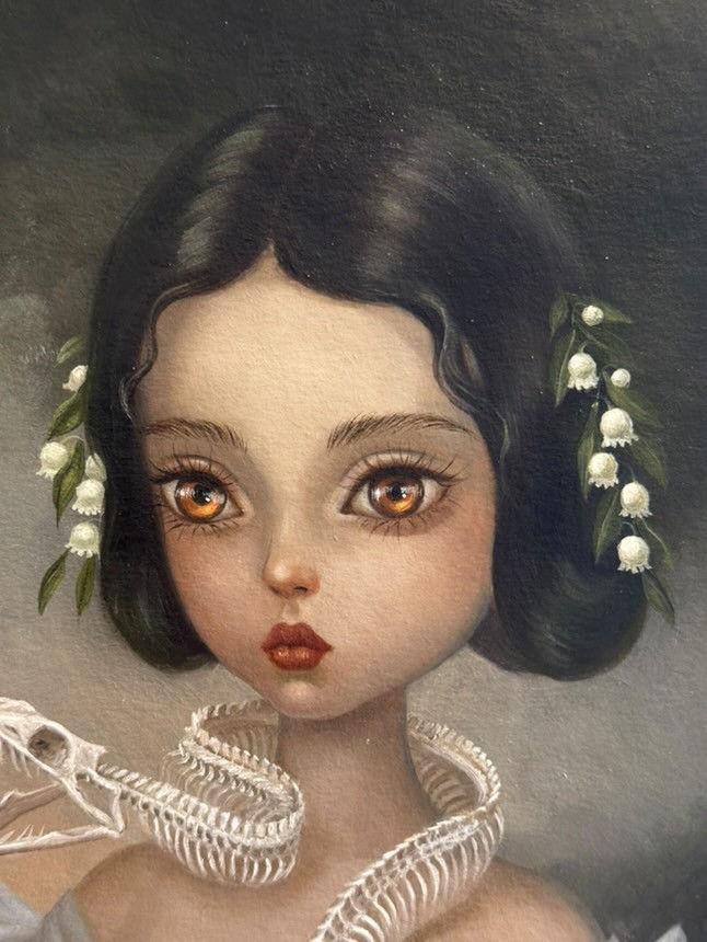 The portrait features a lady of poise and intrigue, adorned with a snake draped around her neck like a scarf — a striking symbol of cunning, transformation, and the unexpected. Wang’s meticulous vintage-surrealist detailingtransforms this unusual accessory into a statement of personality and attitude, blending classical portraiture with fantastical whimsy.