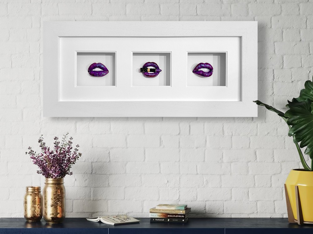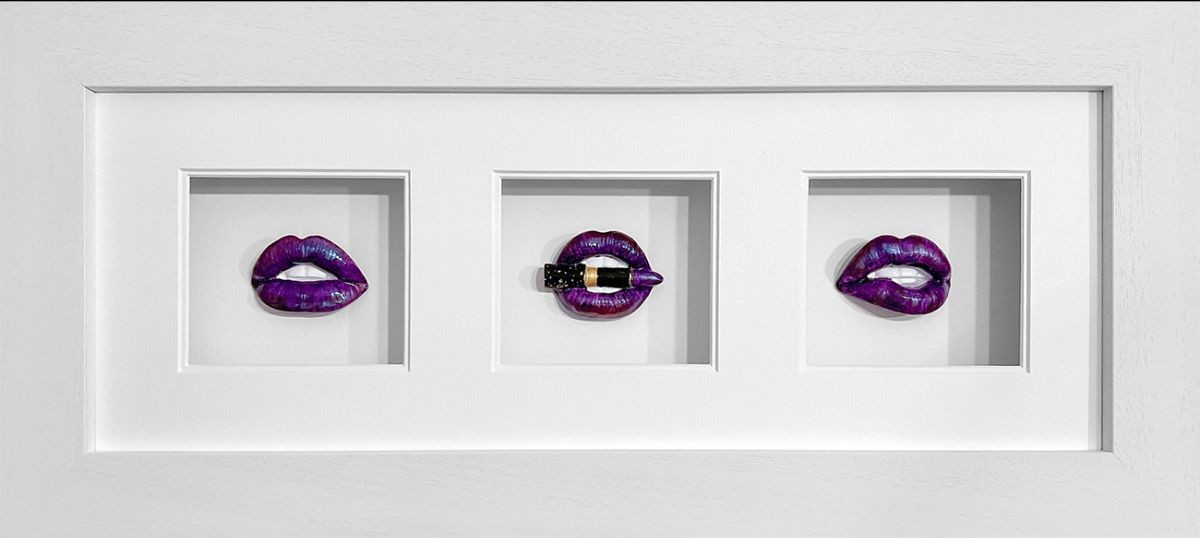 Pucker Up (Purple Lust & Lipstick) is an original 3D triptych installation by contemporary artist Dotty, part of her signature high-gloss resin lips series. This bespoke, hand-made piece captures bold glamour and playful allure, making it a striking addition to any contemporary art collection.