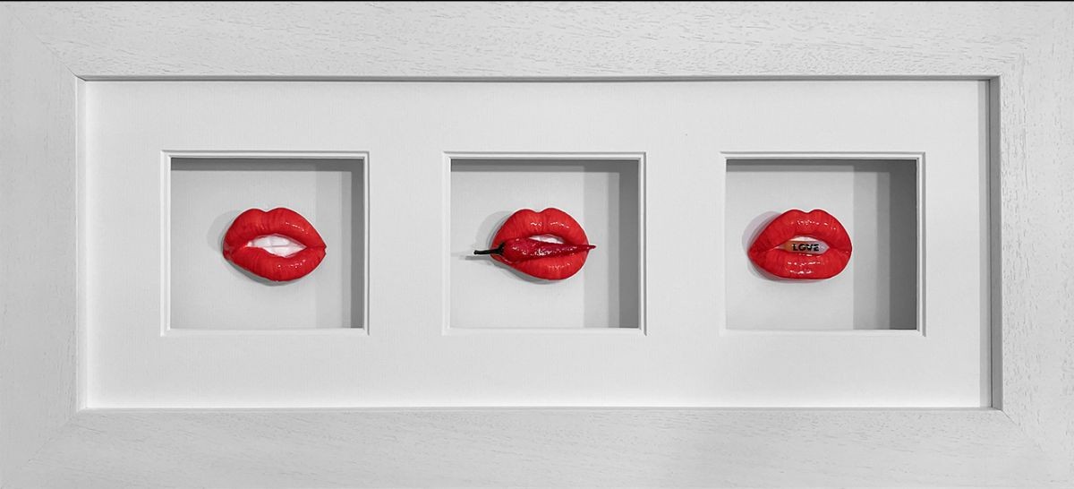 Pucker Up (The Burn & The Cure) is an original 3D triptych installation by contemporary artist Dotty. Part of her acclaimed high-gloss resin lips series, this hand-crafted artwork blends playful sensuality with bold artistic expression.