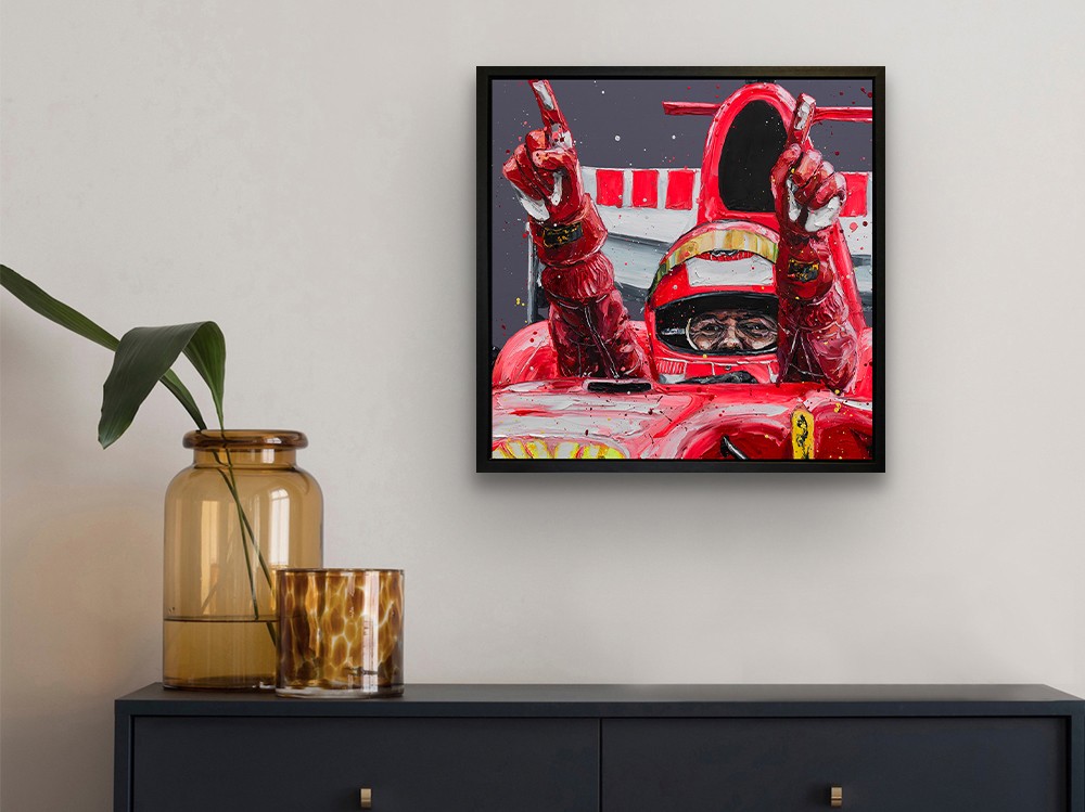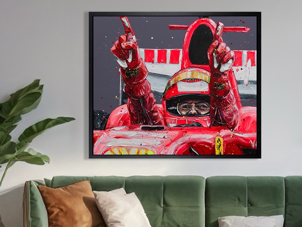 Painted in Paul Oz’s unmistakable high-energy style, Schumacher – Belgium ’06 captures the instant of triumph and farewell — Schumacher standing in his Ferrari, arms raised, acknowledging the crowd after an unforgettable performance at Spa-Francorchamps. Thick impasto textures, explosive splashes of Ferrari red, and dramatic lighting recreate the roar, speed, and raw emotion of Formula 1 at full intensity.