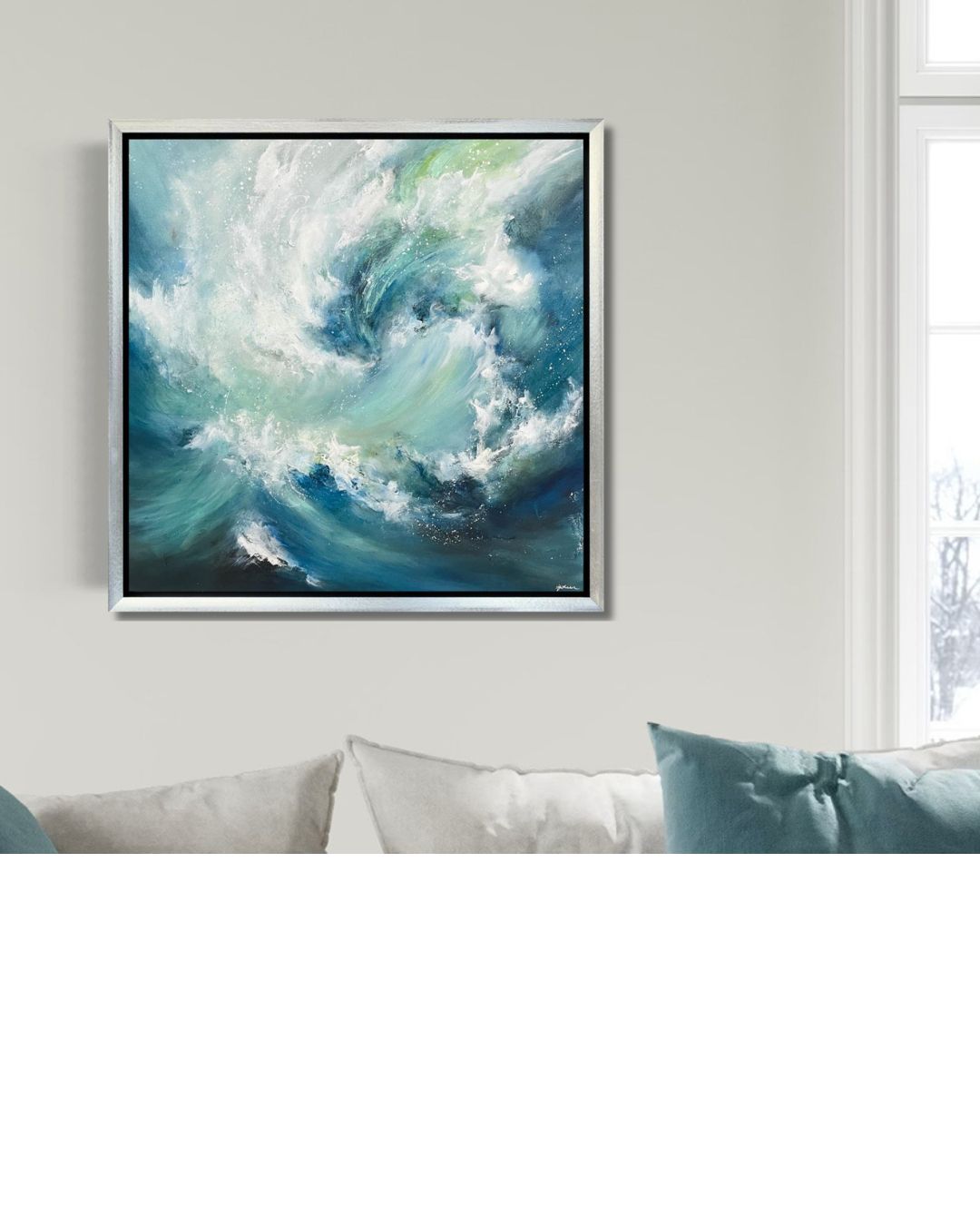 “Sea Crash” by Alison Johnson is a striking original oil painting on canvas that vividly captures the power and motion of the ocean.