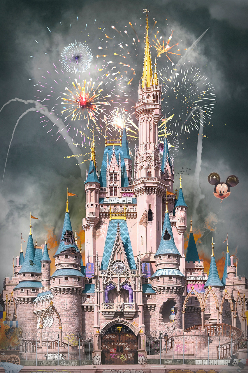 The castle famously serves as the main symbol of the Walt Disney Company, with JJ’s urban themed interpretation reflecting a slightly more ghetto version of the castle in a state of emergency.
