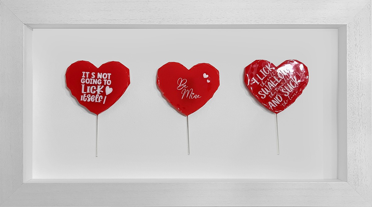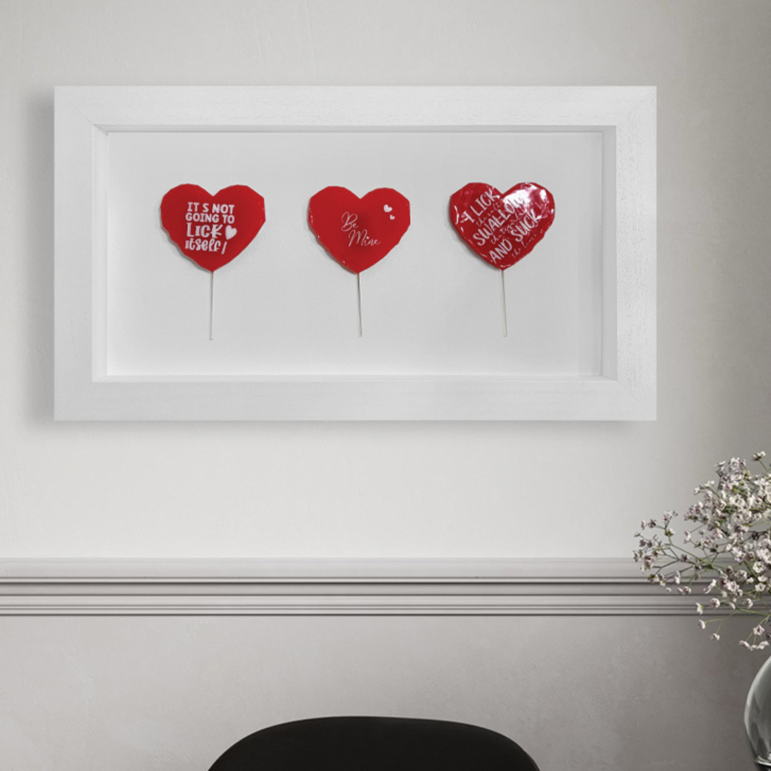 Unique & Bespoke Hand-Made, High Gloss Resin Lolly Hearts - Float framed in White, Satin Finish, 2.5" Deep Shadow Box Frame. White Backing & Matching White Coloured Insert Surround Slip Frame. All production materials are acid free, pH Neutral and of conservation standards.