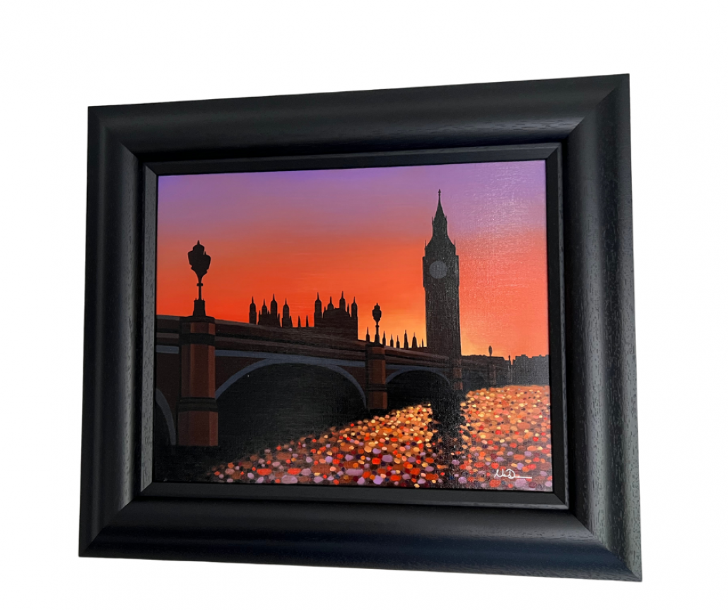 This beautiful original by Neil Dawson depicts an image of a sunset along the River Thames, with orange reflections and light with views overlooking Big Ben and Westminster Bridge.