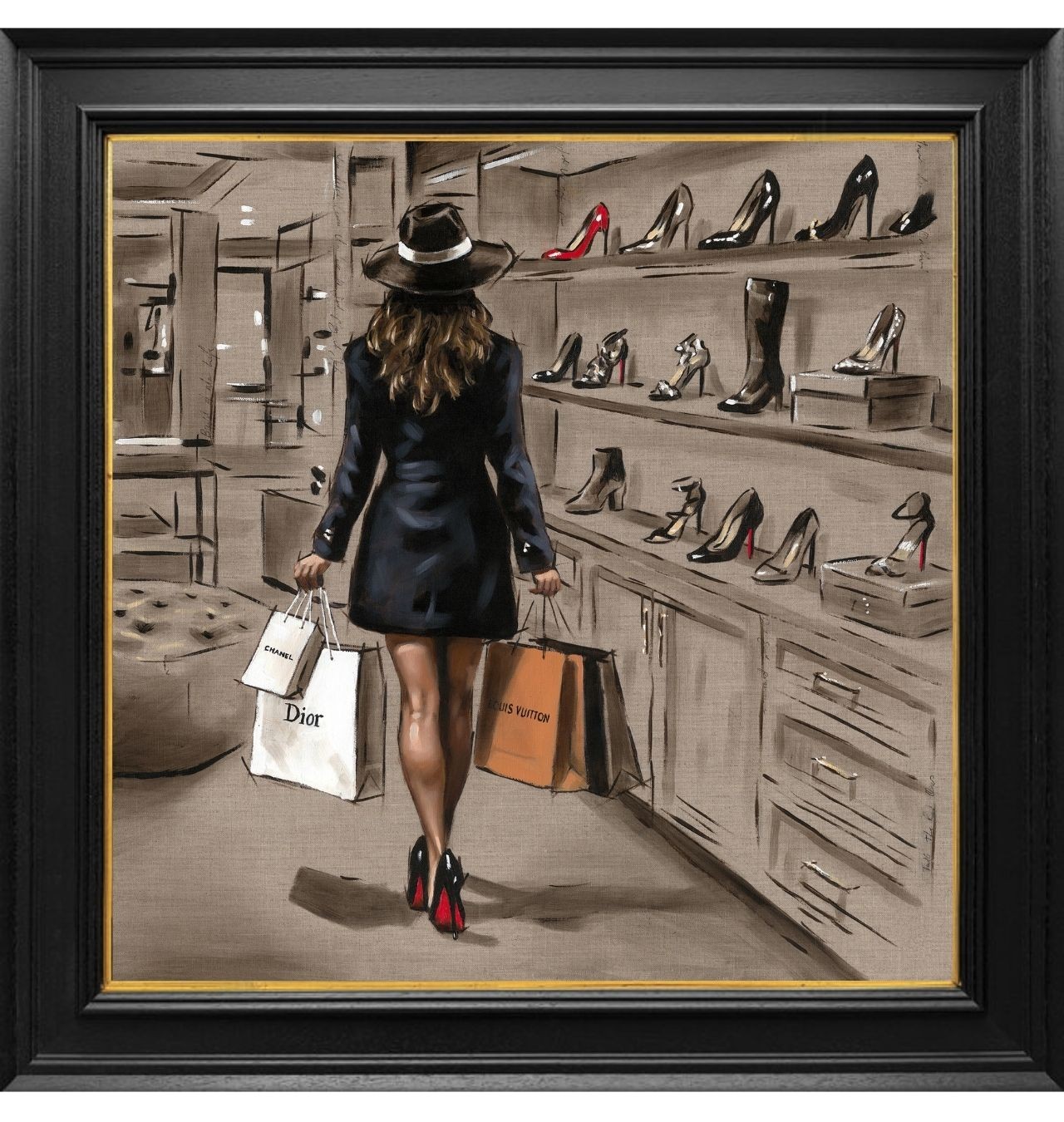 A striking composition of modern luxury and quiet confidence. A poised woman stands in a refined boutique, dressed in a sharply tailored black coat and matching hat, her silhouette effortlessly commanding attention. At her feet, black shoes flash their unmistakable red soles, a subtle yet powerful symbol of taste and indulgence, while shopping bags from iconic houses—Dior, Chanel, and Louis Vuitton—hint at a world of curated opulence.