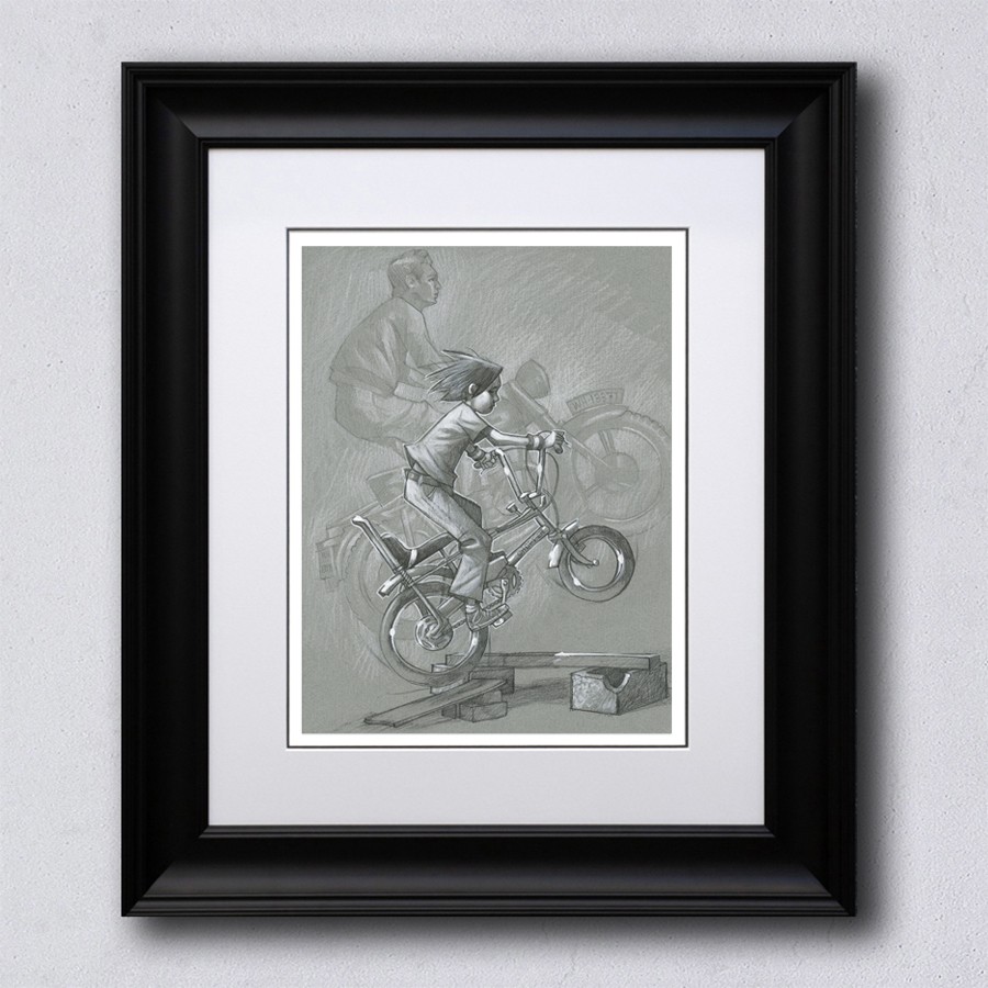 Nostalgia at its finest, Craig Davison brings childhood imagination roaring back to life in this wonderful new release. A young boy sits proudly on his classic Chopper bike, lost in a world of adventure as he re-enacts scenes from The Great Escape. His posture, focus, and determination capture that magical moment where play becomes cinema—where a humble back garden transforms into a legendary wartime escape route.