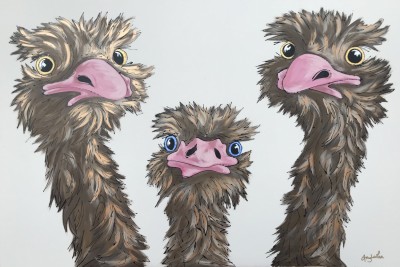 Three's A Crowd, artist Amy Louise original painting. This humorous Amy Louise original painting will never fail to lift your spirits. Three quirky ostriches jostling for your attention painted in her fun, vivid style.The original painting Three's A Crowd by artist Amy Louise is 91 x 61 cm and comes framed.