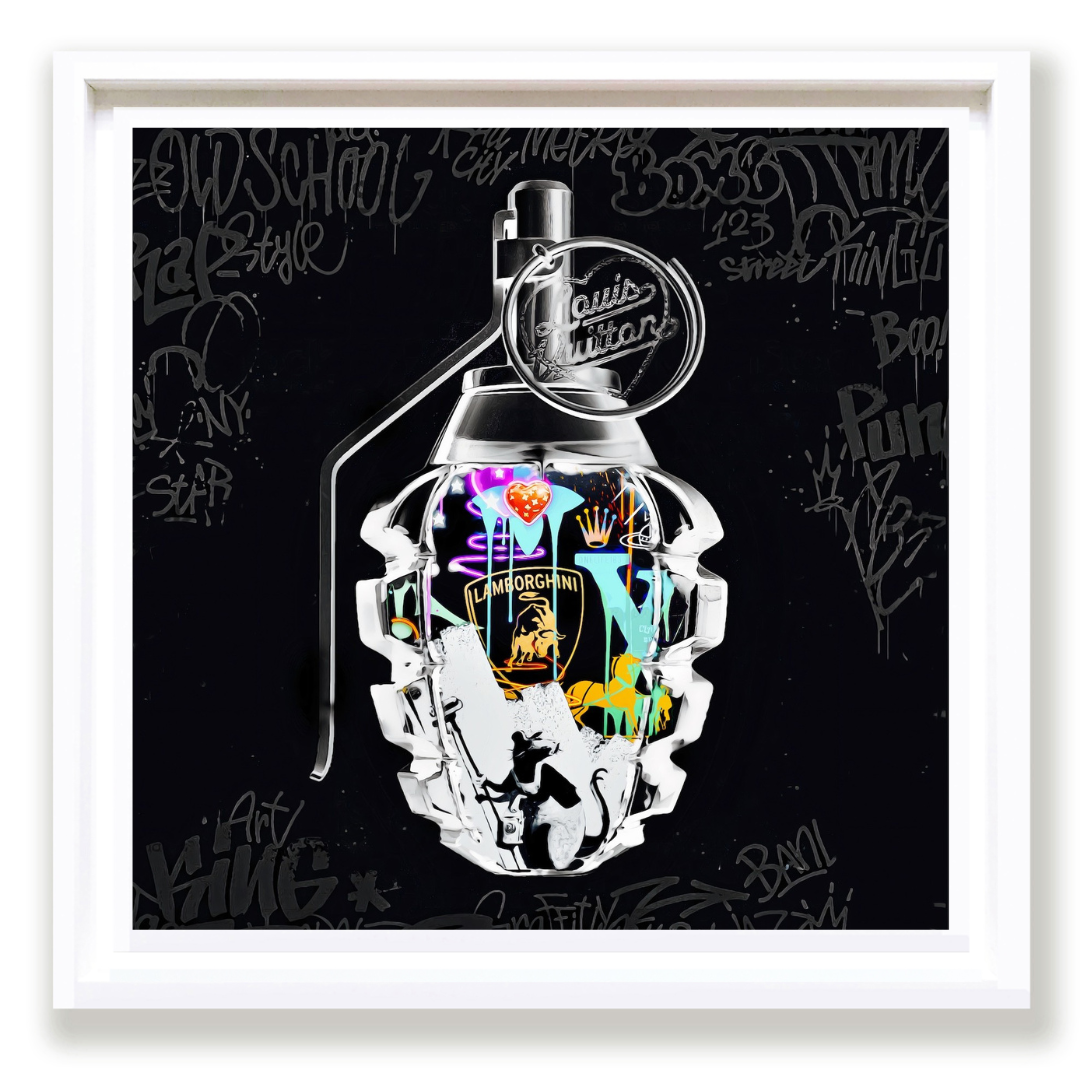 Set against a dark, graffiti-laced backdrop, the piece challenges the viewer to reflect on society’s obsession with materialism and image. Neon icons glow from within, turning the grenade into a glamorised symbol of consumer culture, where status and style become tools of both influence and destruction.
