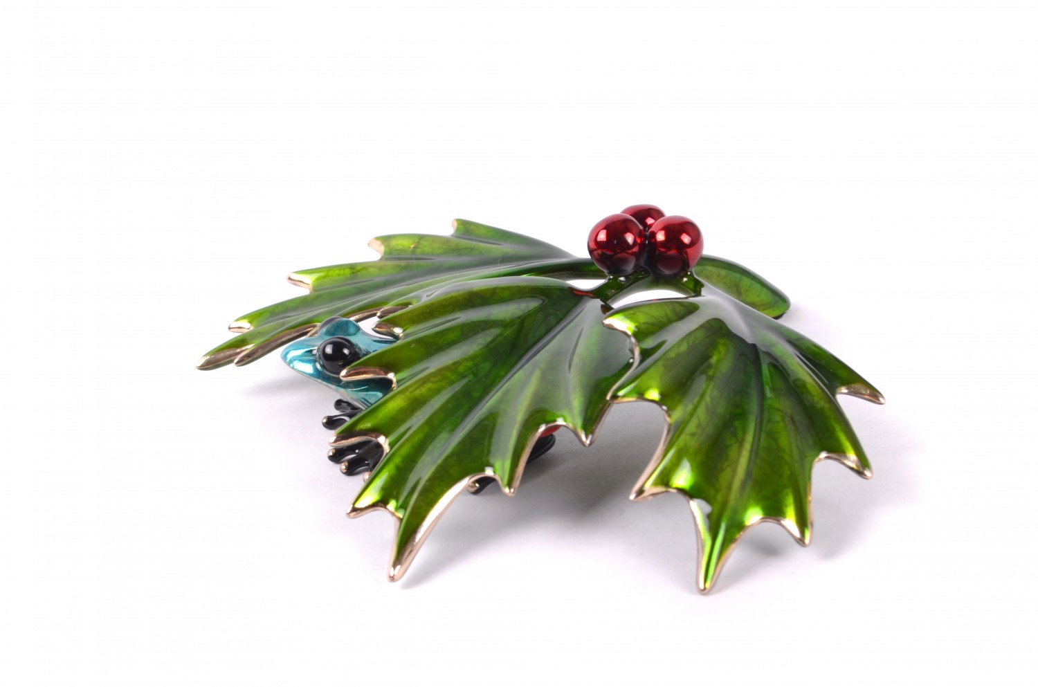 An ice blue Frog under green holly leaves with three perfectly placed red holly berries. The perfect Frogman Bronze for established and new collectors this festive season