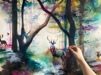 Enchanting and mysterious. Using rich tones with glistening highlights a forest was created, inviting the viewer to walk through the woodland path. Silhuettes, shadows and highlights accentuate the backdrop of a sun dappled woodland, teaming with wildlife roaming freely. A proud stag stands tall near the entrance of the path, alert and regal looking directly forwards. The sky is stippled with dense canopies of the treetops where gentle leaves sway and branches reach and curl. The jewel toned oil paints lend themselves well to this layered and silhouetted piece, offering depth to the landscape with an enchanting prisma of colours, deepening to suit the richness of the forest.