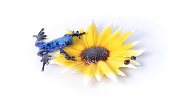 Zephyr stands at 6.5 x 5.5 x 1.75". Casually lounging on a bright sunflower, Zephyr's bright blue pops out playfully against the flower's vibrant yellow.
